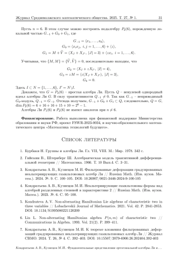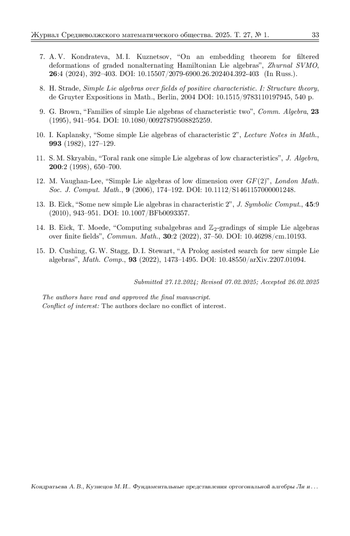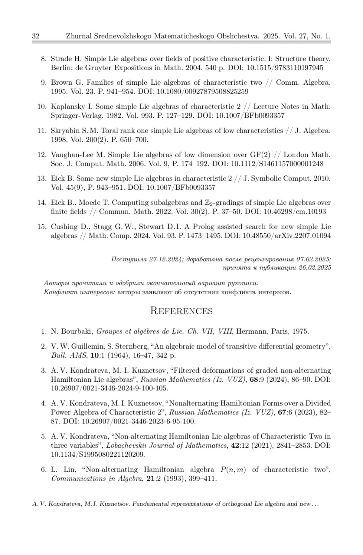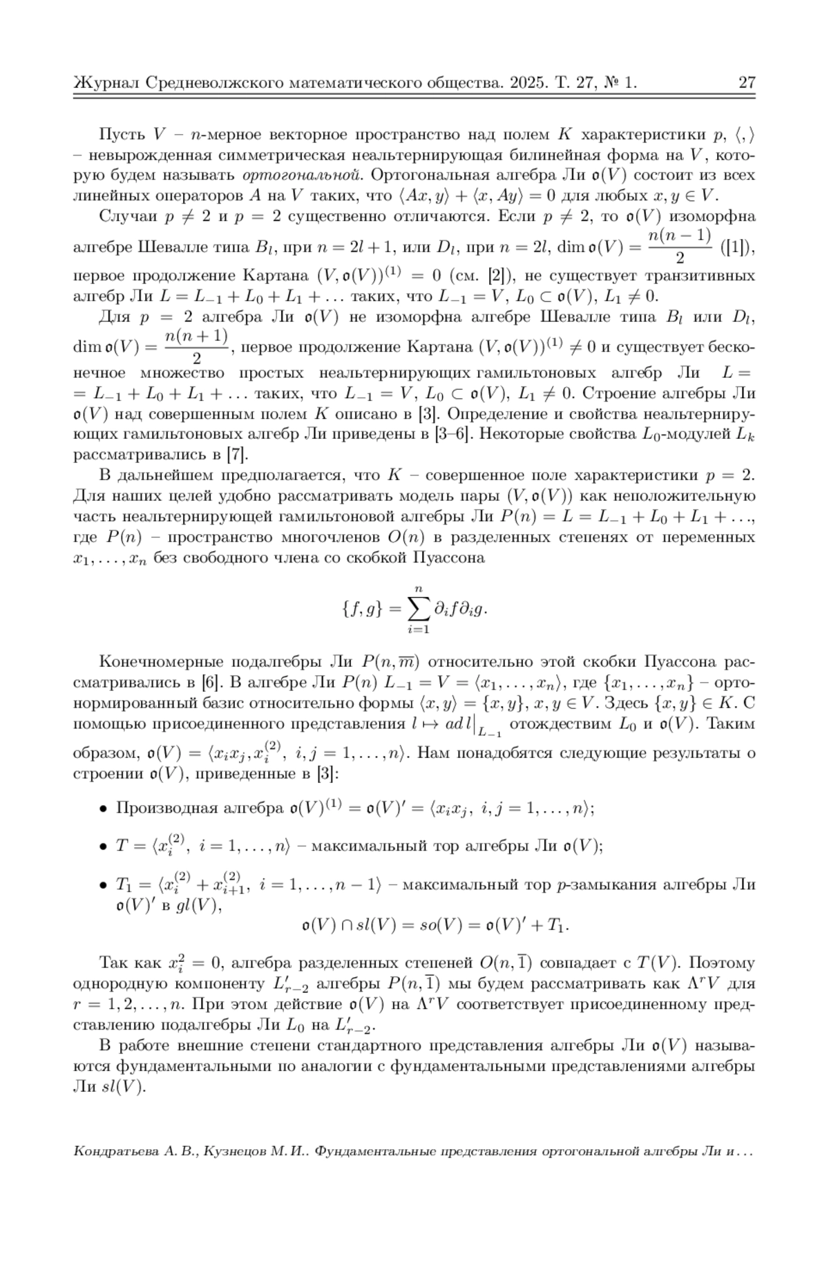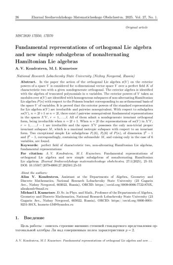 В работе для векторного пространства V размерности n над совершенным полем K характеристика два с заданной невырожденной ортогональной формой рассматривается действие ортогональной алгебры Ли o(V ) на внешних степенях пространства V. Внешняя алгебра отождествляется с алгеброй срезанных многочленов от n неизвестных, а внешние степени как модули над o(V ) – с однородными подпространствами неальтернирующей гамильтоновой алгебры Ли P(n) относительно скобки Пуассона, соответствующей ортонормированному базису пространства переменных. Доказывается, что все внешние степени стандартного представления алгебры Ли o(V ) неприводимы и попарно неэквивалентны. Относительно подалгебры so(V ), n = 2l + 1 или n = 2l, существует l попарно неэквивалентных фундаментальных представлений в пространствах \Lambda rV, r = 1,…, l. Все они допускают невырожденную инвариантную ортогональную форму и неприводимы при n = 2l + 1. При n = 2l представления so(V ) на \Lambda rV, r = 1,…, l 1 неприводимы, а пространство \Lambda lV имеет единственное нетривиальное собственное инвариантное подпространство M, которое является максимальным изотропным подпространством относительно инвариантной формы. Найдены две исключительные простые подалгебры Ли P1(6), P2(6) в P(6), размерности 25 1 и 26 1, соответственно, содержащие подмодуль M, которые существуют только в случае 6 неизвестных.