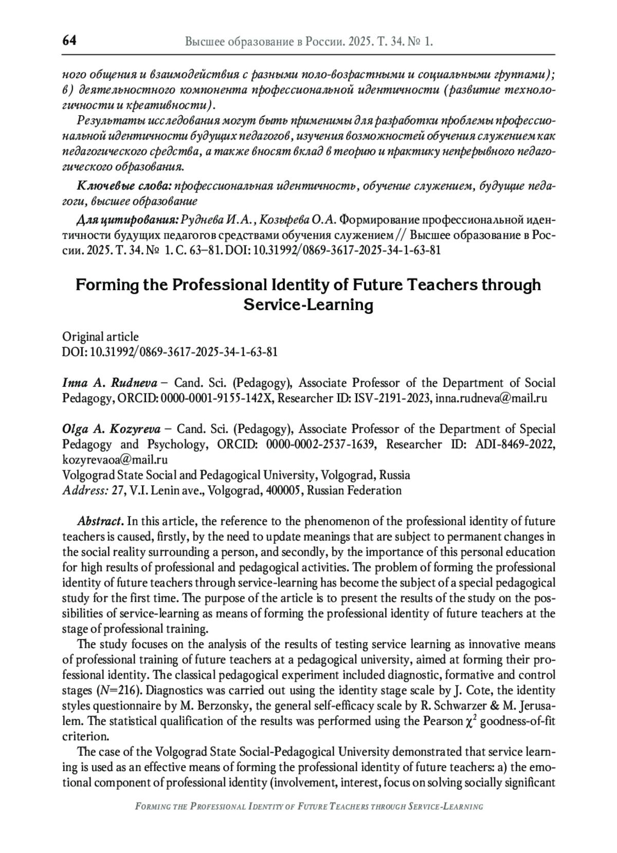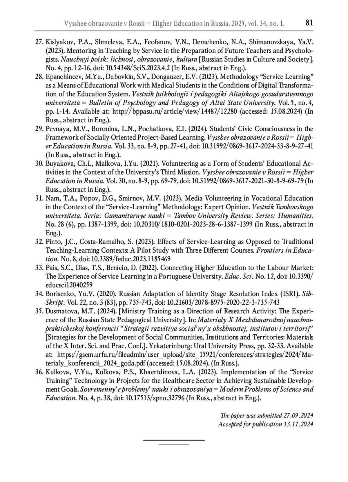 32. Pinto J.C., Costa-Ramalho S. Effects of service-learning as opposed to traditional teaching-learning contexts: a pilot study with three different courses // Frontiers in Education. 2023. No. 8. DOI: 10.3389/feduc.2023.1185469 EDN: QHCXRF