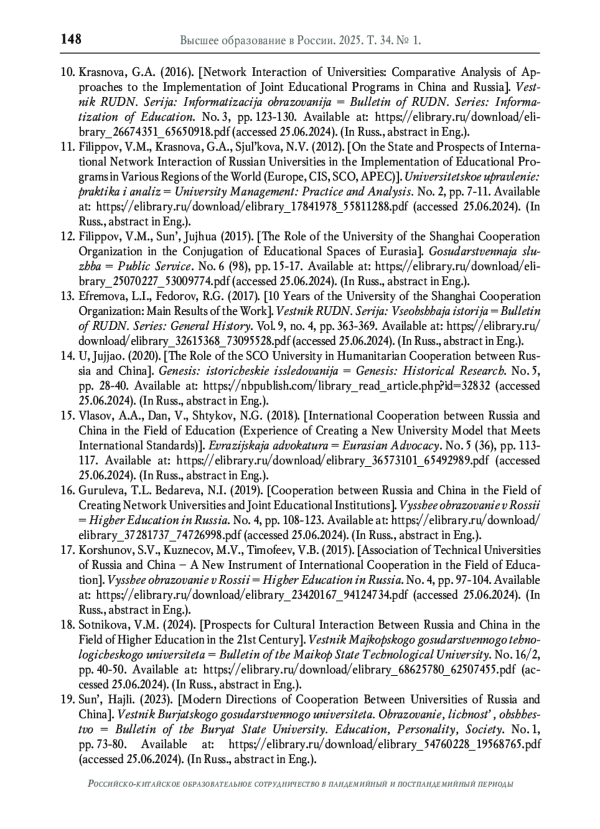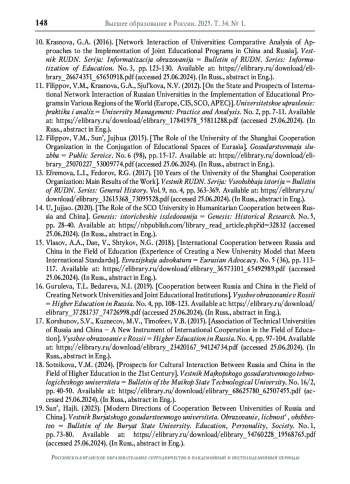16. Гурулева Т.Л. Бедарева Н.И. Сотрудничество России и Китая в области создания сетевых университетов и совместных образовательных учреждений // Высшее образование в России. 2019. № 4. С. 108-123. EDN: GZYQKO