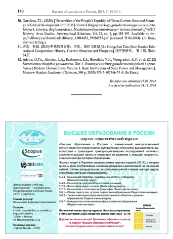 30. Гурулева Т.Л. Университеты КНР: современное состояние и стратегия глобального развития до 2035 года // Вестник Волгоградского государственного университета. Серия 4, История. Регионоведение. Международные отношения. 2020. Т. 25. № 2. С. 185-197. EDN: CTUVSZ