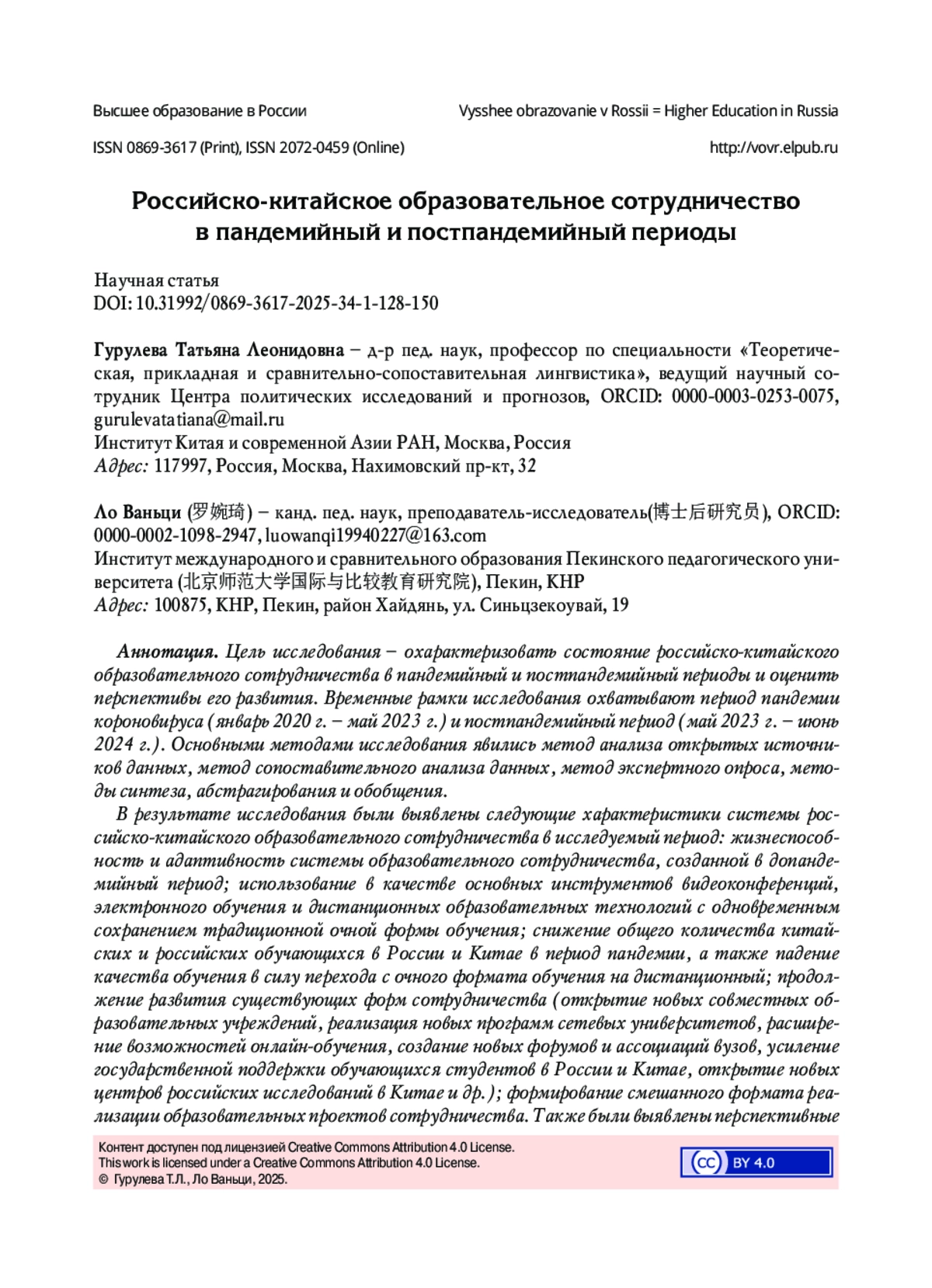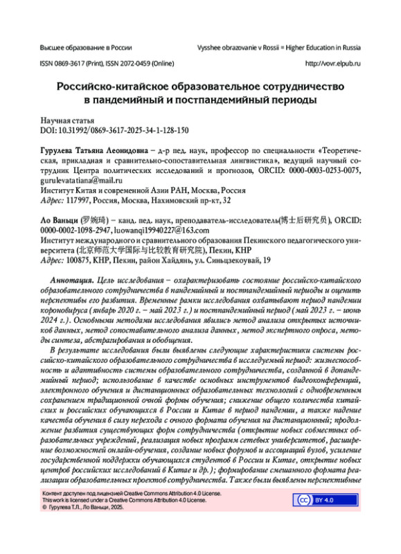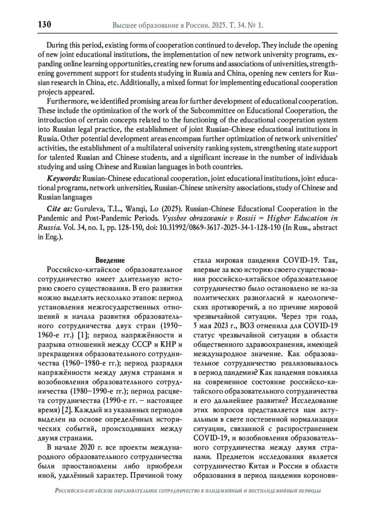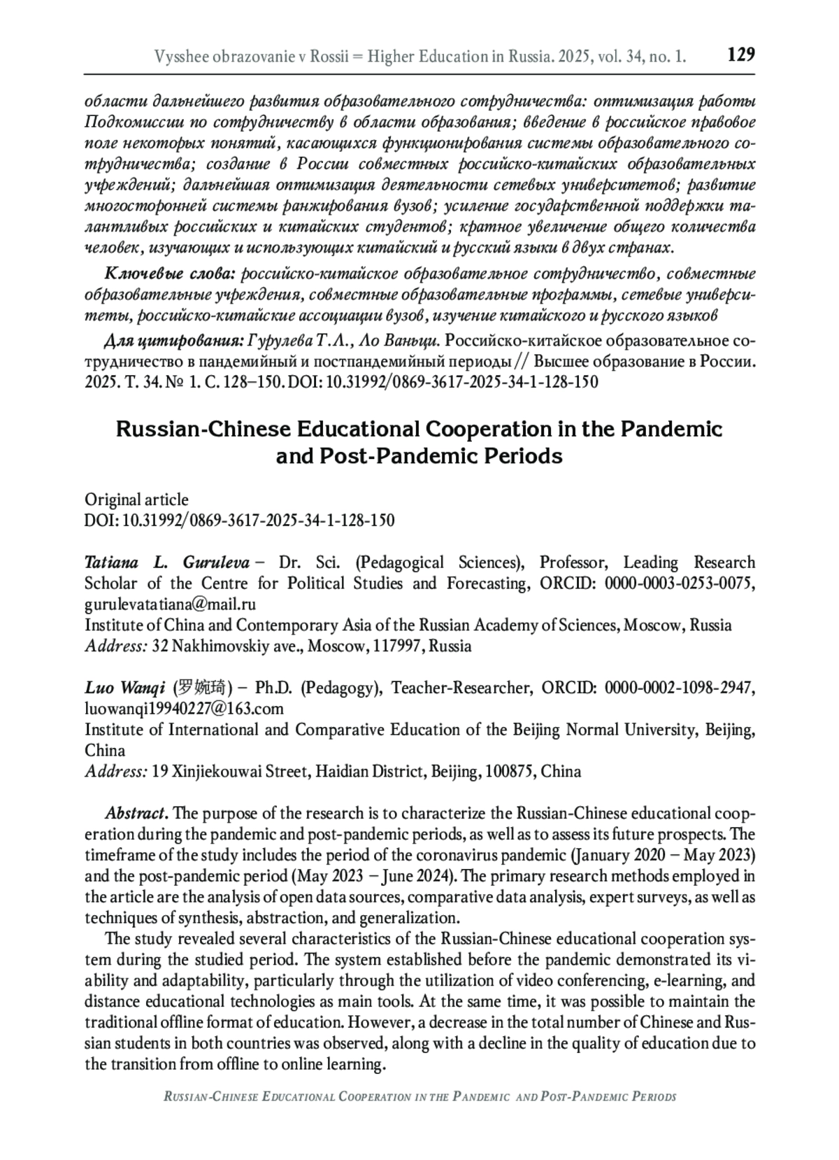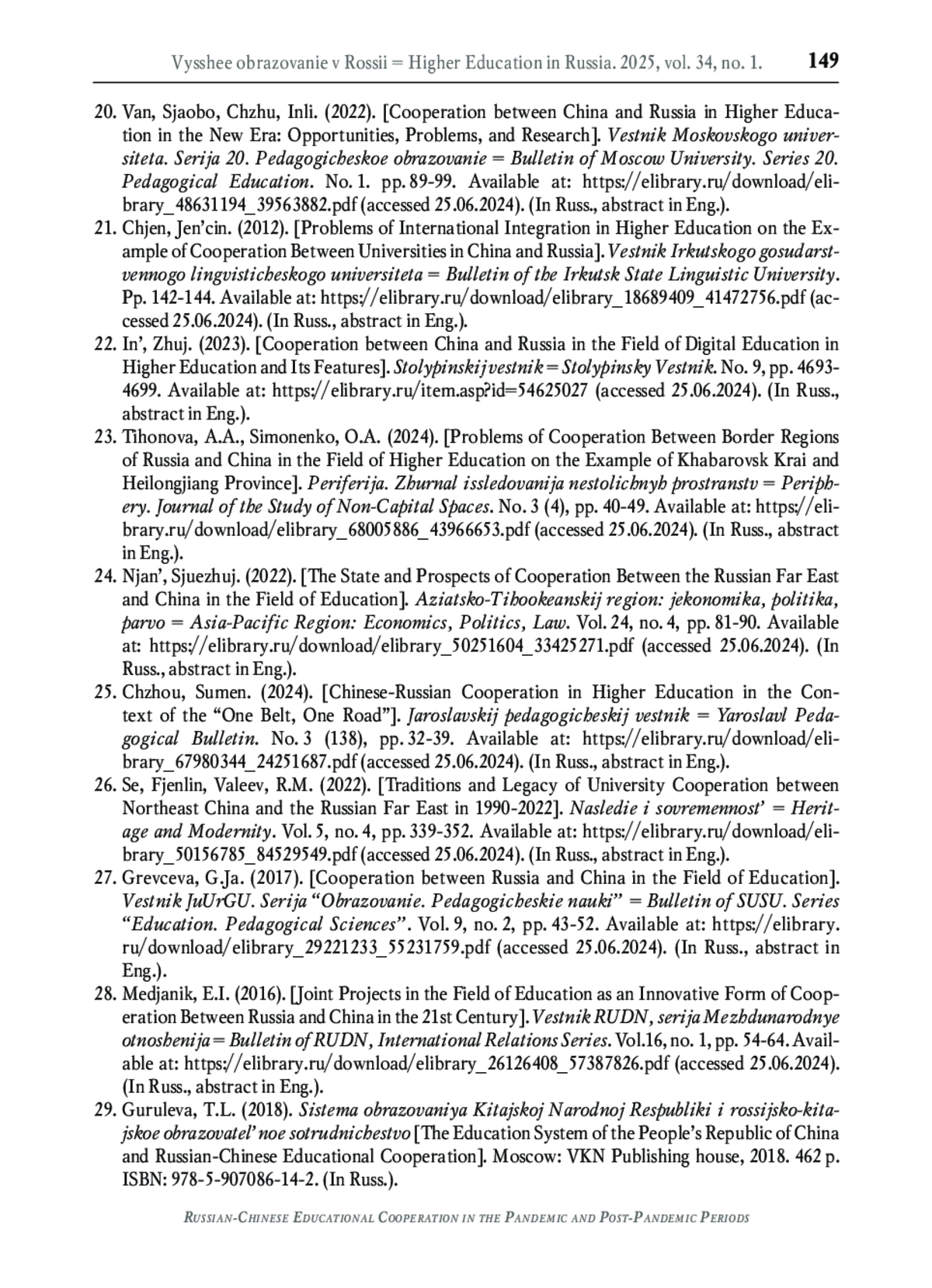20. Ван Сяобо, Чжу Инли. Сотрудничество Китая и России в сфере высшего образования в новую эпоху: возможности, проблемы и исследования // Вестник Московского университета. Серия 20. Педагогическое образование. 2022. № 1. С. 89-99. EDN: YIMZLU