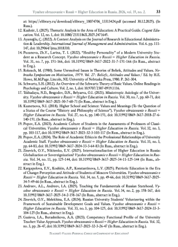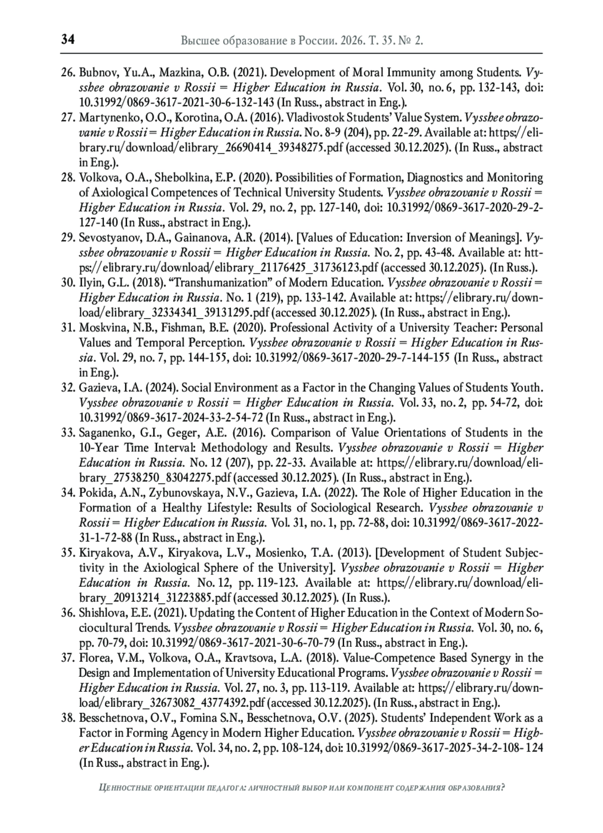 31. Москвина Н.Б., Фишман Б.Е. Профессиональная деятельность преподавателя вуза: ценностно-временные коллизии // Высшее образование в России. - 2020. - Т. 29, № 7. - С. 144-155. -. DOI: 10.31992/0869-3617-2020-29-7-144-155 EDN: LGZBZP
