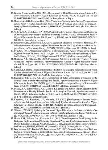 36. Шишлова Е.Э. Обновление содержания высшего образования в контексте современных социокультурных трендов // Высшее образование в России. - 2021. - Т. 30, № 6. - С. 70-79. -. DOI: 10.31992/0869-3617-2021-30-6-70-79 EDN: YKPFGT