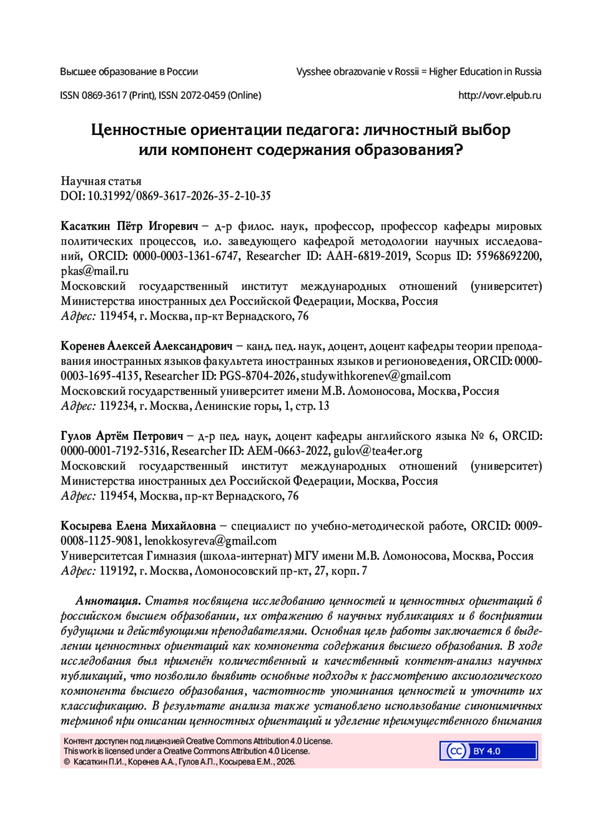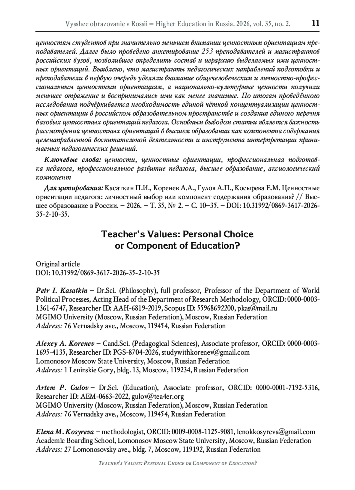 3. Яковлева И.В., Черных С.И., Косенко Т.С. “Аксиологический разворот” в российском образовании: позиция субъективизма // Высшее образование в России. - 2022. - Т. 31, № 4. - С. 113-127. -. DOI: 10.31992/0869-3617-2022-31-4-113-127 EDN: BXPKGU
