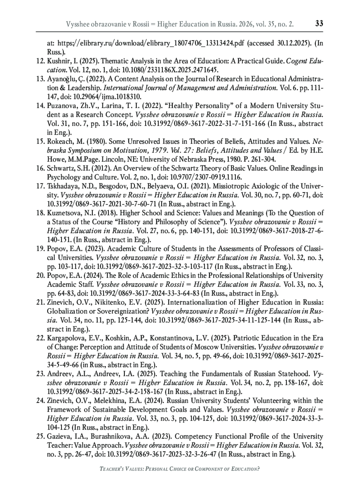 25. Газиева И.А., Бурашникова А.А. Компетентностный функциональный профиль преподавателя вуза: ценностный подход // Высшее образование в России. - 2023. - Т. 32, № 3. - С. 26-47. -. DOI: 10.31992/0869-3617-2023-32-3-26-47 EDN: CPIFIC