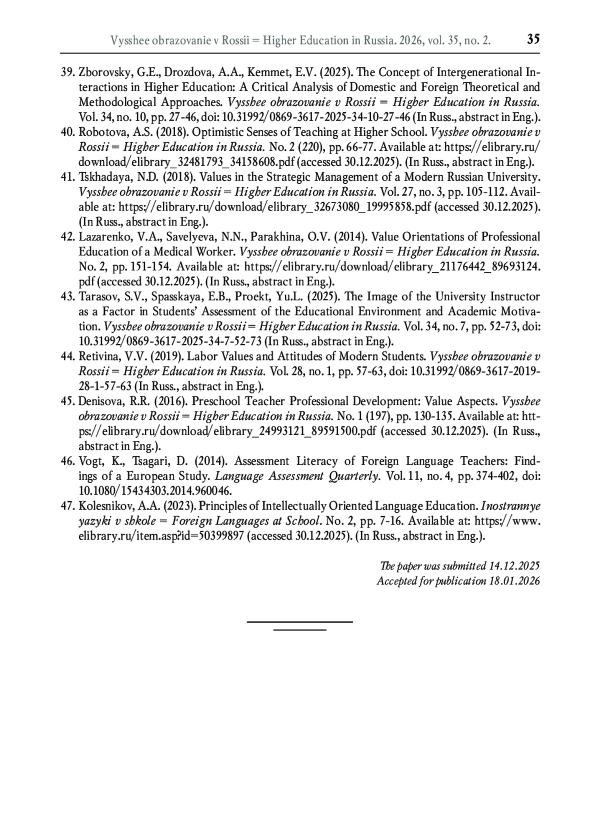 43. Тарасов С.В., Спасская Е.Б., Проект Ю.Л. Образ преподавателя как фактор оценки образовательной среды вуза и учебной мотивации студентов // Высшее образование в России. - 2025. - Т. 34, № 7. - С. 52-73. -. DOI: 10.31992/0869-3617-2025-34-7-52-73 EDN: EDUWLN
