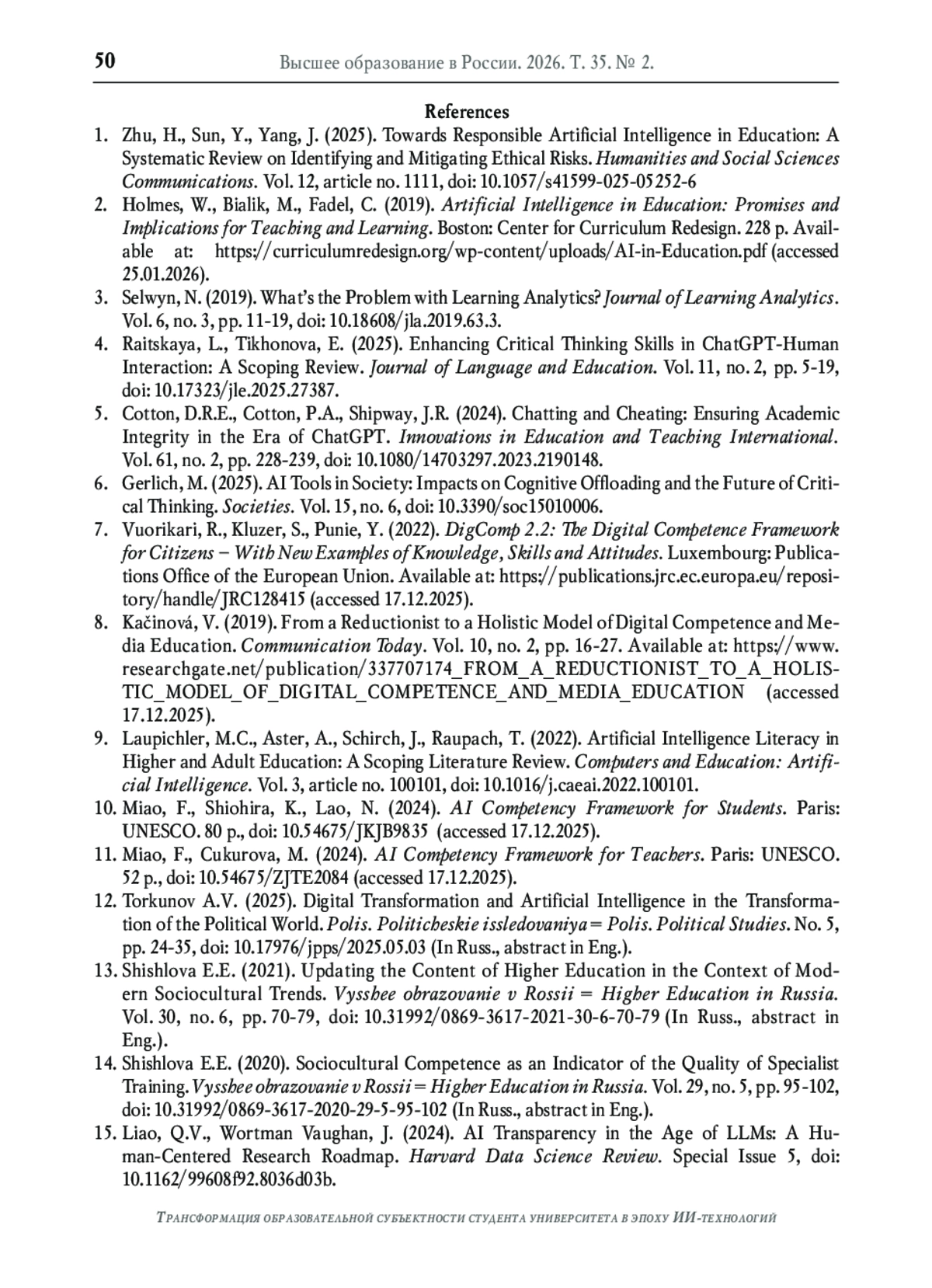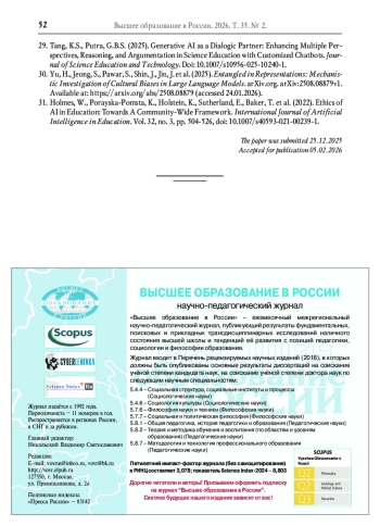 31. Holmes W., Porayska-Pomsta K., Holstein K., Sutherland E., Baker T. et al. Ethics of AI in education: Towards a community-wide framework // International Journal of Artificial Intelligence in Education. - 2022. - Vol. 32, no. 3. - P. 504-526. - Статья поступила в редакцию 25.12.2025. DOI: 10.1007/s40593-021-00239-1 EDN: IWWZJQ
