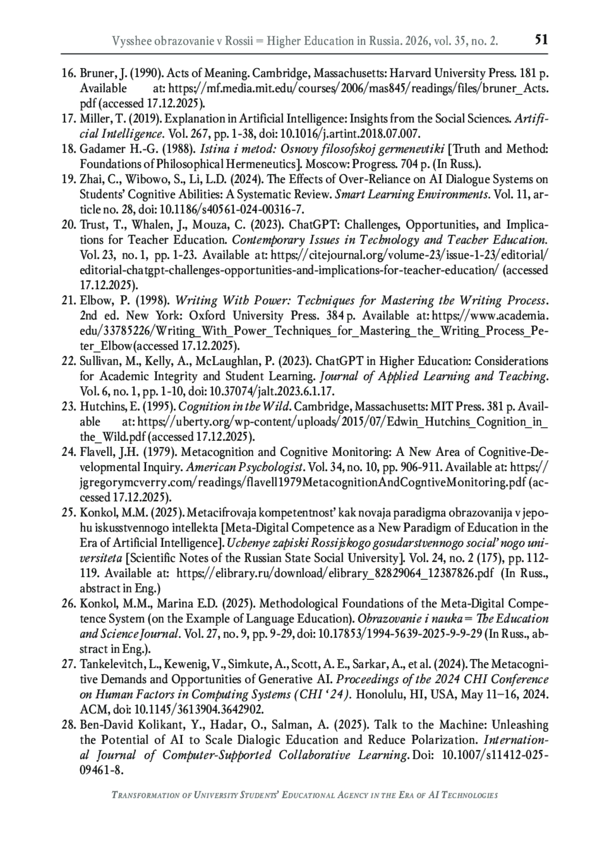 24. Flavell J.H. Metacognition and cognitive monitoring: A new area of cognitive-developmental inquiry // American Psychologist. - 1979. - Vol. 34, no. 10. - P. 906-911. - URL: https://jgregorymcverry.com/readings/flavell1979 MetacognitionAndCogntiveMonitoring.pdf (дата обращения: 17.12.2025).