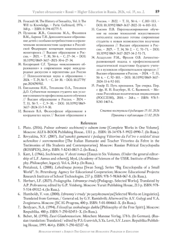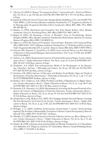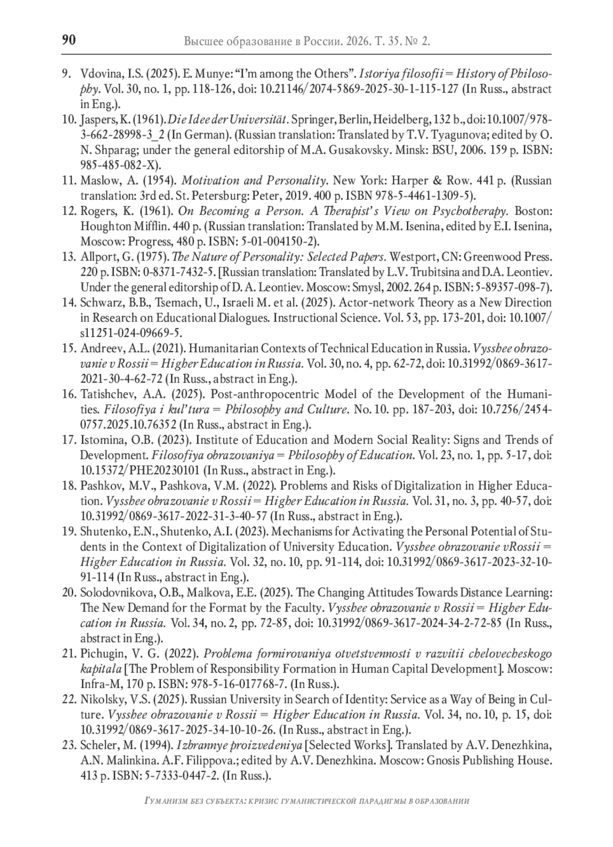 22. Никольский В.С. Российский университет в поисках идентичности: служение как способ бытия в культуре // Высшее образование в России. - 2025. - Т. 34, № 10. - С. 10-26. -. DOI: 10.31992/0869-3617-2025-34-10-10-26 EDN: GJVWAF