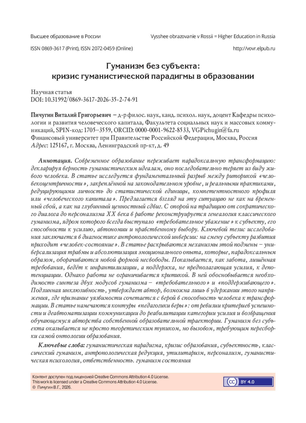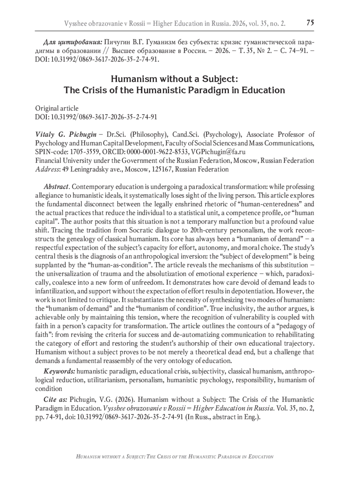 Современное образование переживает парадоксальную трансформацию: декларируя верность гуманистическим идеалам, оно последовательно теряет из виду живого человека. В статье исследуется фундаментальный разрыв между риторикой «человекоцентричности», закреплённой на законодательном уровне, и реальными практиками, редуцирующими личность до статистической единицы, компетентностного профиля или «человеческого капитала». Предлагается взгляд на эту ситуацию не как на временный сбой, а как на глубинный ценностный сдвиг. С опорой на традицию от сократического диалога до персонализма XX века в работе реконструируется генеалогия классического гуманизма, ядром которого всегда выступало «требовательное уважение» к субъекту, его способности к усилию, автономии и нравственному выбору. Ключевой тезис исследования заключается в диагностике антропологической инверсии: на смену субъекту развития приходит «человек-состояние». В статье раскрываются механизмы этой подмены - универсализация травмы и абсолютизация эмоционального опыта, которые, парадоксальным образом, оборачиваются новой формой несвободы. Показывается, как забота, лишённая требования, ведёт к инфантилизации, а поддержка, не предполагающая усилия, к депотенциации. Однако работа не ограничивается критикой. В ней обосновывается необходимость синтеза двух модусов гуманизма - «требовательного» и «поддерживающего». Подлинная инклюзивность, утверждает автор, возможна лишь в удержании этого напряжения, где признание уязвимости сочетается с верой в способность человека к трансформации. В статье намечаются контуры «педагогики веры»: от ревизии критериев успешности и деавтоматизации коммуникации до реабилитации категории усилия и возвращения обучающемуся авторства собственной образовательной траектории. Гуманизм без субъекта оказывается не просто теоретическим тупиком, но вызовом, требующим пересборки самой онтологии образования.