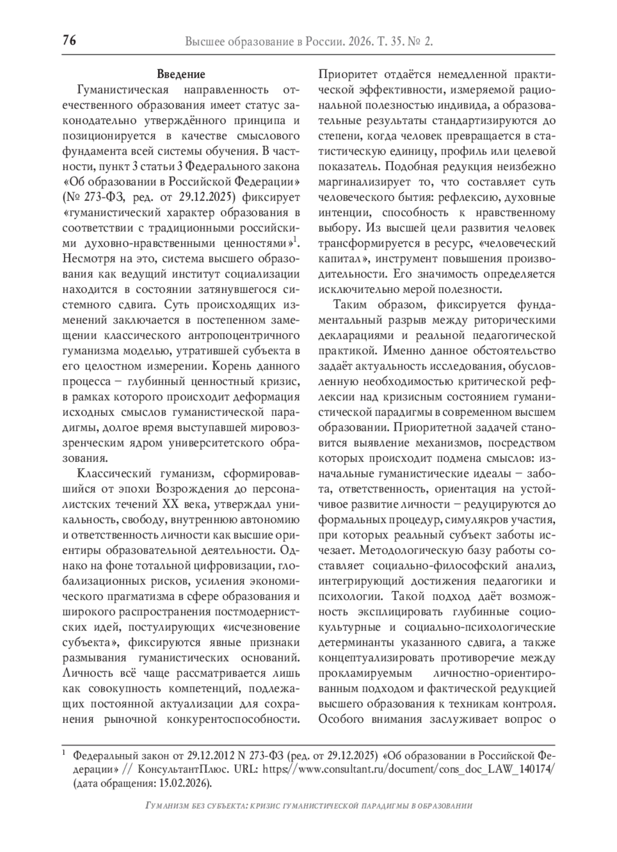 Гуманистическая направленность отечественного образования имеет статус законодательно утверждённого принципа и позиционируется в качестве смыслового фундамента всей системы обучения. В частности, пункт 3 статьи 3 Федерального закона «Об образовании в Российской Федерации» (№273-ФЗ, ред. от 29.12.2025) фиксирует «гуманистический характер образования в соответствии с традиционными российскими духовно-нравственными ценностями»1. Несмотря на это, система высшего образования как ведущий институт социализации находится в состоянии затянувшегося системного сдвига.