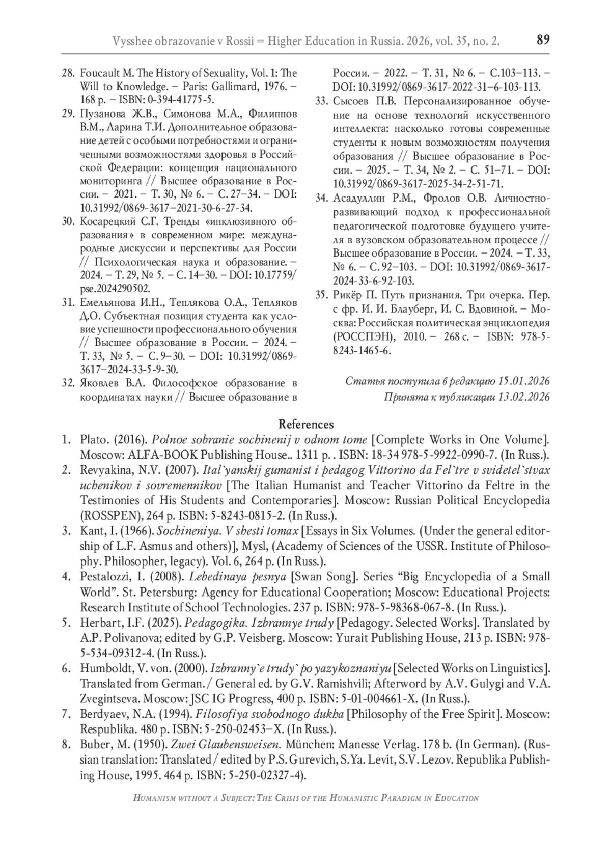 32. Яковлев В.А. Философское образование в координатах науки // Высшее образование в России. - 2022. - Т. 31, № 6. - С.103-113. -. DOI: 10.31992/0869-3617-2022-31-6-103-113 EDN: YXJWAR