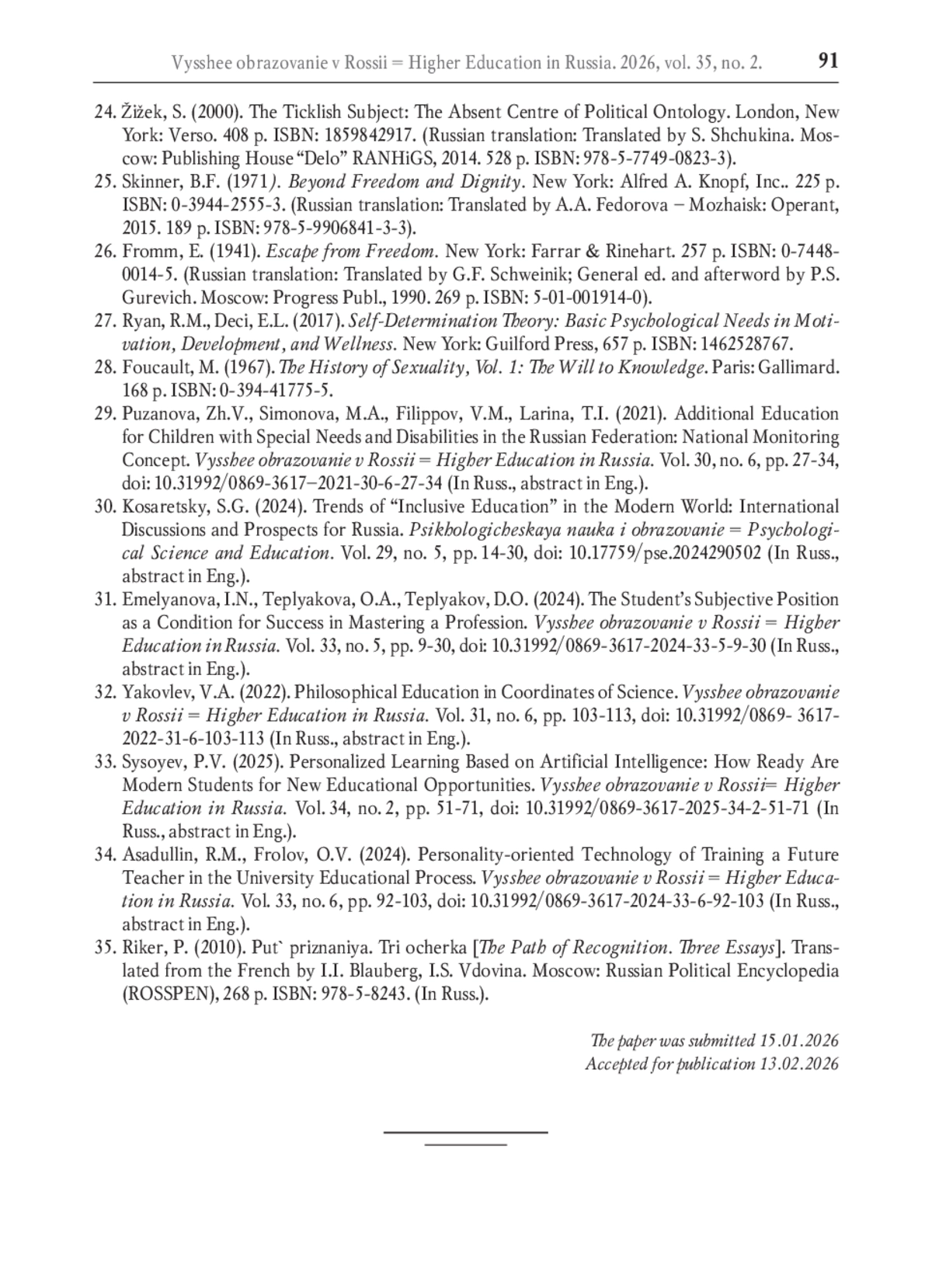 31. Емельянова И.Н., Теплякова О.А., Тепляков Д.О. Субъектная позиция студента как условие успешности профессионального обучения // Высшее образование в России. - 2024. - Т. 33, № 5. - С. 9-30. -. DOI: 10.31992/0869-3617-2024-33-5-9-30 EDN: ITFVYT
