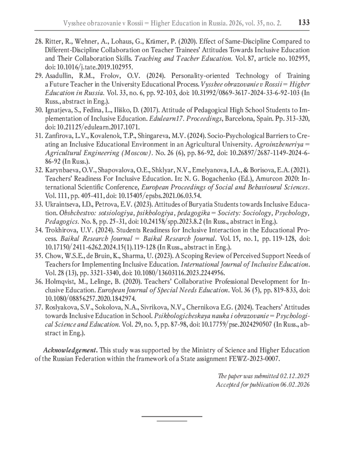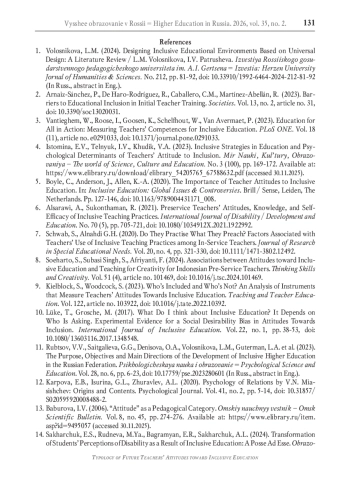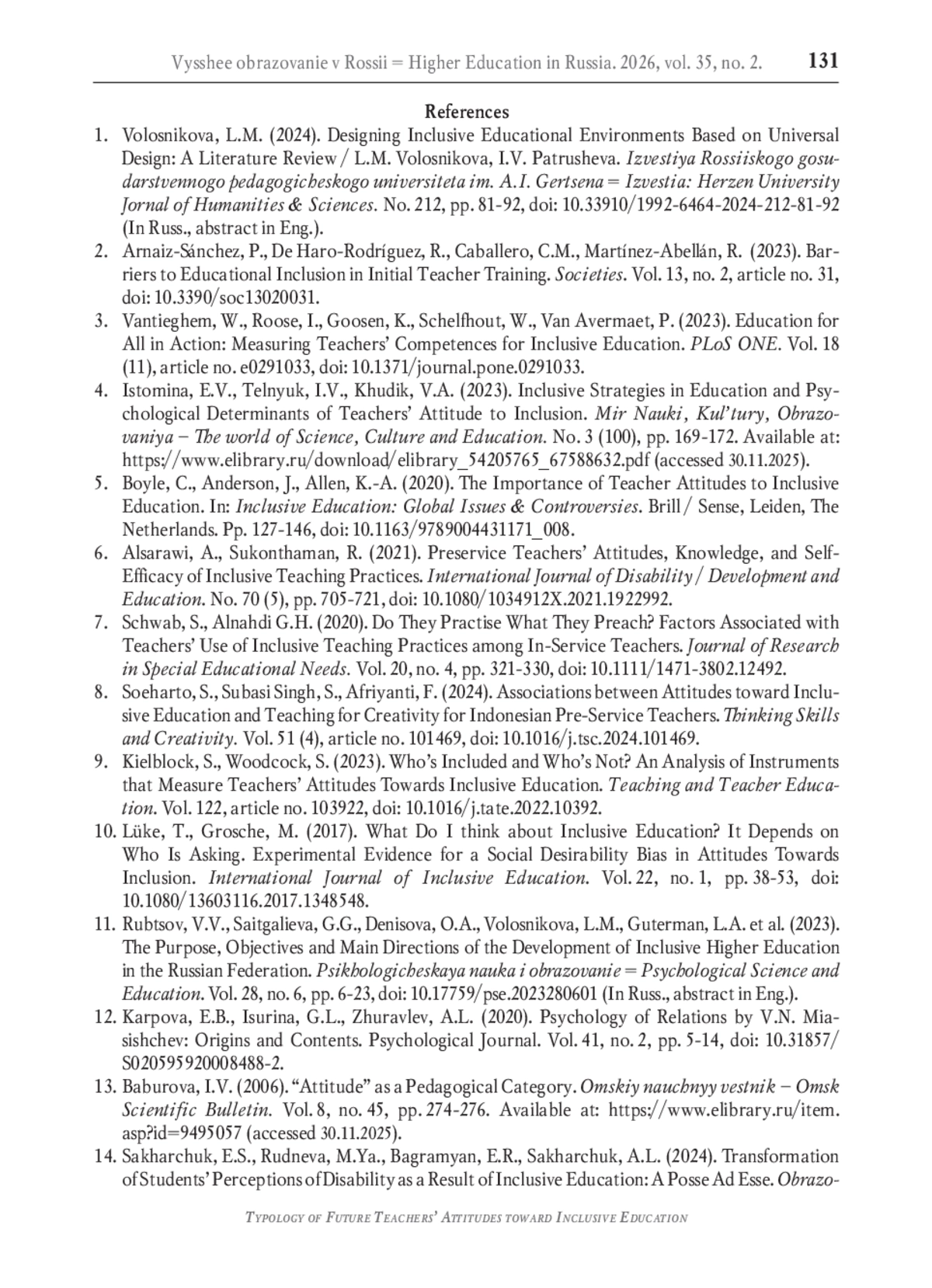 37. Рослякова С.В., Соколова Н.А., Сиврикова Н.В., Черникова Е.Г. Отношение педагогов к инклюзивному образованию в школе // Психологическая наука и образование. - 2024. - Т. 29, № 5. - С. 87-98. -. DOI: 10.17759/pse.2024290507 EDN: HFVRES