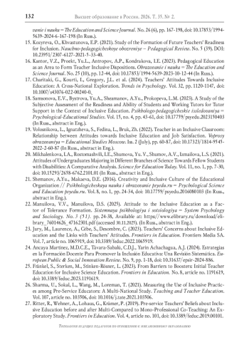 17. Charitaki G., Kourti I., Gregory J.L. et al. Teachers’ Attitudes Towards Inclusive Education: a Cross-National Exploration // Trends in Psychology. - 2024. - Vol. 32. - P. 120-1147. -. DOI: 10.1007/s43076-022-00240-0 EDN: DQMIDS