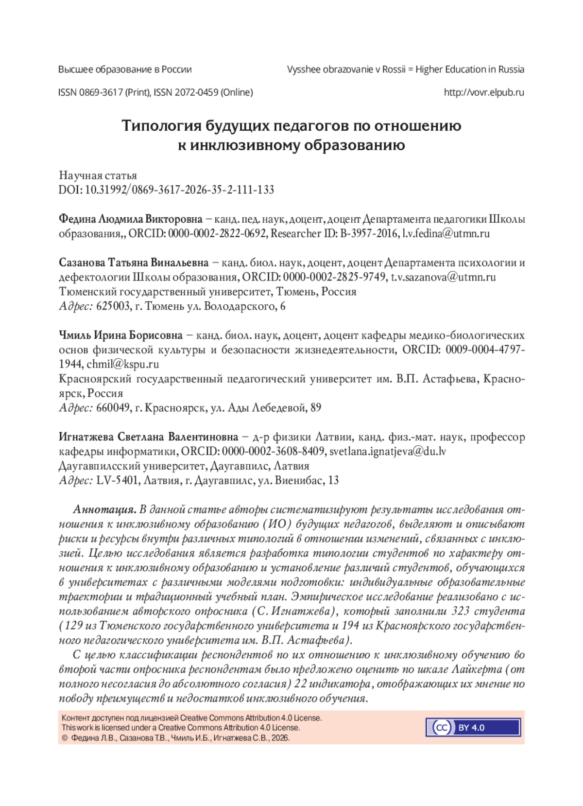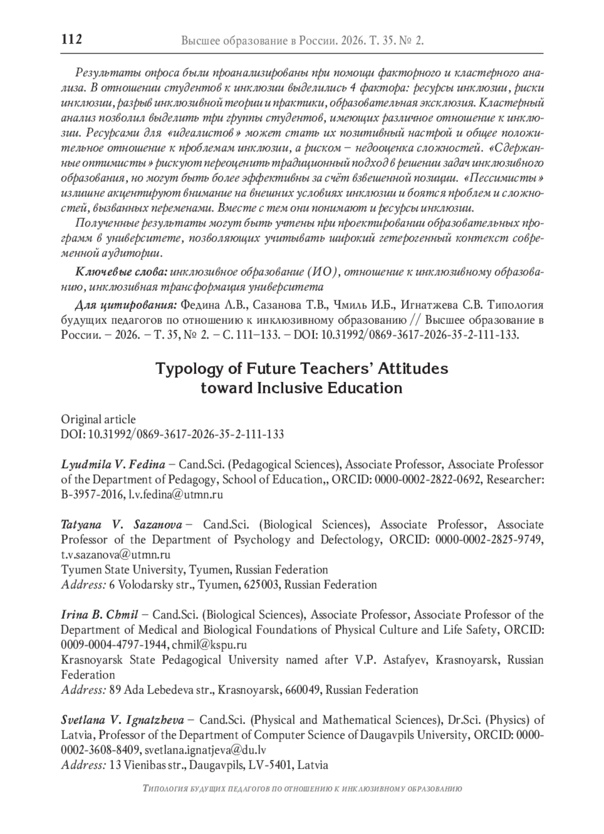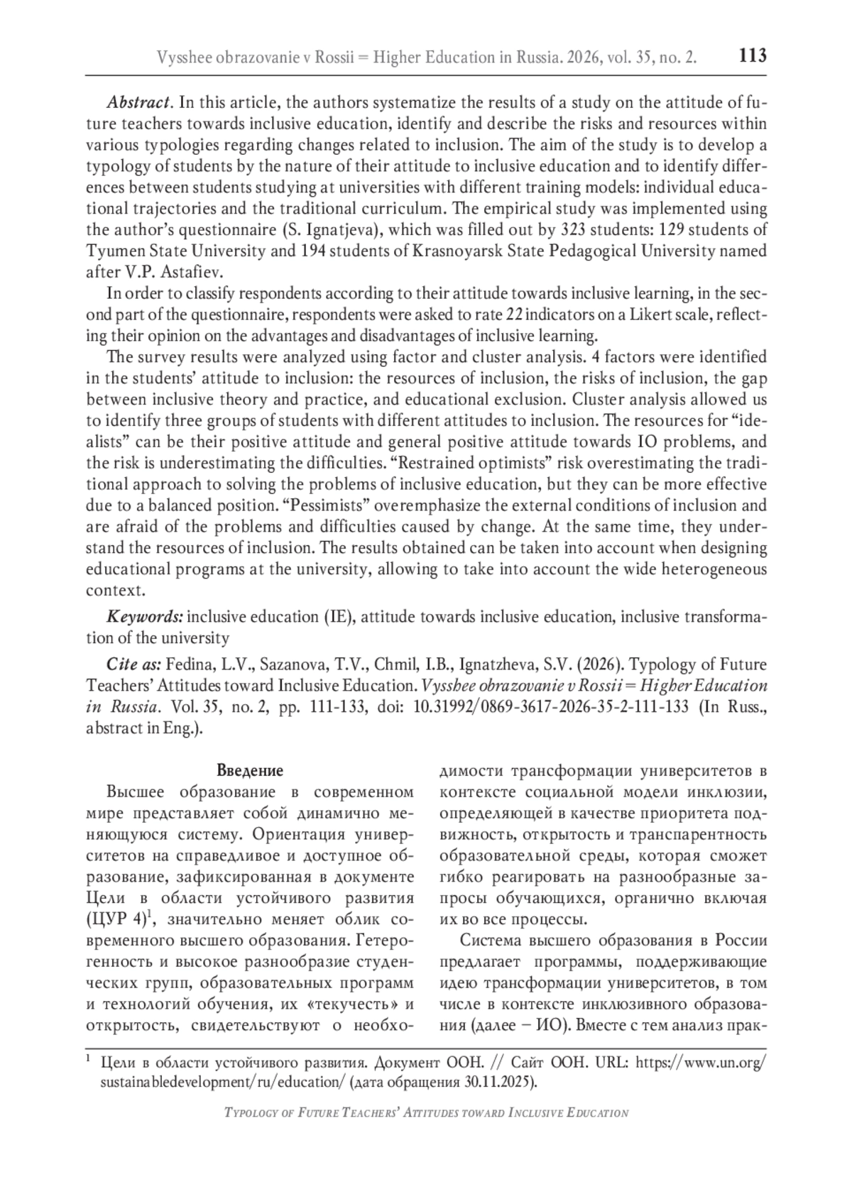 В данной статье авторы систематизируют результаты исследования отношения к инклюзивному образованию (ИО) будущих педагогов, выделяют и описывают риски и ресурсы внутри различных типологий в отношении изменений, связанных с инклюзией. Целью исследования является разработка типологии студентов по характеру отношения к инклюзивному образованию и установление различий студентов, обучающихся в университетах с различными моделями подготовки: индивидуальные образовательные траектории и традиционный учебный план. Эмпирическое исследование реализовано с использованием авторского опросника (С. Игнатжева), который заполнили 323 студента (129 из Тюменского государственного университета и 194 из Красноярского государственного педагогического университета им. В. П. Астафьева). С целью классификации респондентов по их отношению к инклюзивному обучению во второй части опросника респондентам было предложено оценить по шкале Лайкерта (от полного несогласия до абсолютного согласия) 22 индикатора, отображающих их мнение по поводу преимуществ и недостатков инклюзивного обучения. Результаты опроса были проанализированы при помощи факторного и кластерного анализа. В отношении студентов к инклюзии выделились 4 фактора: ресурсы инклюзии, риски инклюзии, разрыв инклюзивной теории и практики, образовательная эксклюзия. Кластерный анализ позволил выделить три группы студентов, имеющих различное отношение к инклюзии. Ресурсами для «идеалистов» может стать их позитивный настрой и общее положительное отношение к проблемам инклюзии, а риском - недооценка сложностей. «Сдержанные оптимисты» рискуют переоценить традиционный подход в решении задач инклюзивного образования, но могут быть более эффективны за счёт взвешенной позиции. «Пессимисты» излишне акцентируют внимание на внешних условиях инклюзии и боятся проблем и сложностей, вызванных переменами. Вместе с тем они понимают и ресурсы инклюзии. Полученные результаты могут быть учтены при проектировании образовательных программ в университете, позволяющих учитывать широкий гетерогенный контекст современной аудитории.