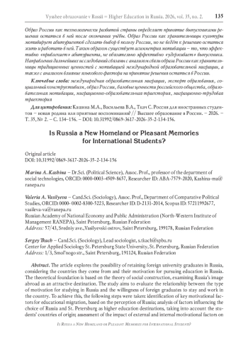 В статье рассматривается потенциал закрепления в России иностранных выпускников университетов с учётом их мотивации к получению российского образования и стран, откуда они приехали. Теоретическую рамку составила теория социального конструирования в контексте формирования имиджа России за рубежом как привлекательной страны. Цель исследования - оценка характера связи между типом мотивации получения образования в России и желанием иностранных выпускников остаться работать и жить в России. Для достижения цели 1) были определены основные мотивационные факторы образовательной миграции на основе образа России, который с ними связан; 2) проведён анализ факторов выбора России и Санкт-Петербурга как места получения высшего образования с учётом стран исхода студентов; 3) осуществлена оценка влияния внешних и внутренних мотивационных факторов получения российского образования на желание остаться работать и жить в России. Дизайн исследования - качественно-количественный. Эмпирическая база - онлайн-опрос иностранных обучающихся петербургских вузов (N = 436), 7 фокус-групп в 5 вузах Санкт-Петербурга (N = 46). Методы анализа - регрессионный анализ, попарные сравнения, качественный анализ материалов фокус-групп. По результатам исследования были сделаны следующие выводы. Необходимо аналитическое разведение двух контуров образовательной миграции - факторов «входа» и факторов «послеучебного закрепления». Образ России как технологически развитой страны определяет принятие выпускниками решения остаться в ней после окончания учёбы. Образ России как хранительницы культуры мотивирует абитуриентов сделать выбор в пользу России, но не ведёт к решению остаться жить и работать в ней. Таким образом существует асимметрия мотивации - то, что эффективно «привлекает» абитуриента, не обязательно эффективно «удерживает» выпускника. Направления дальнейших исследований связаны с анализом связи образа России как хранительницы традиционных ценностей с мотивацией международной образовательной миграции, а также с анализом влияние языкового фактора на принятие решения остаться в России.