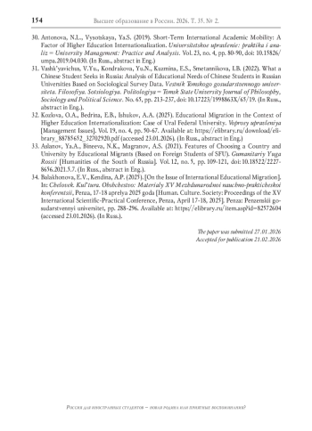 32. Козлова О.А., Бедрина Е.Б., Ишуков А.А. Образовательная миграция в контексте интернационализации высшего образования: кейс Уральского федерального университета // Вопросы управления. - 2025. - Т. 19, № 4. - С. 50-67. -. EDN: RYVTVF