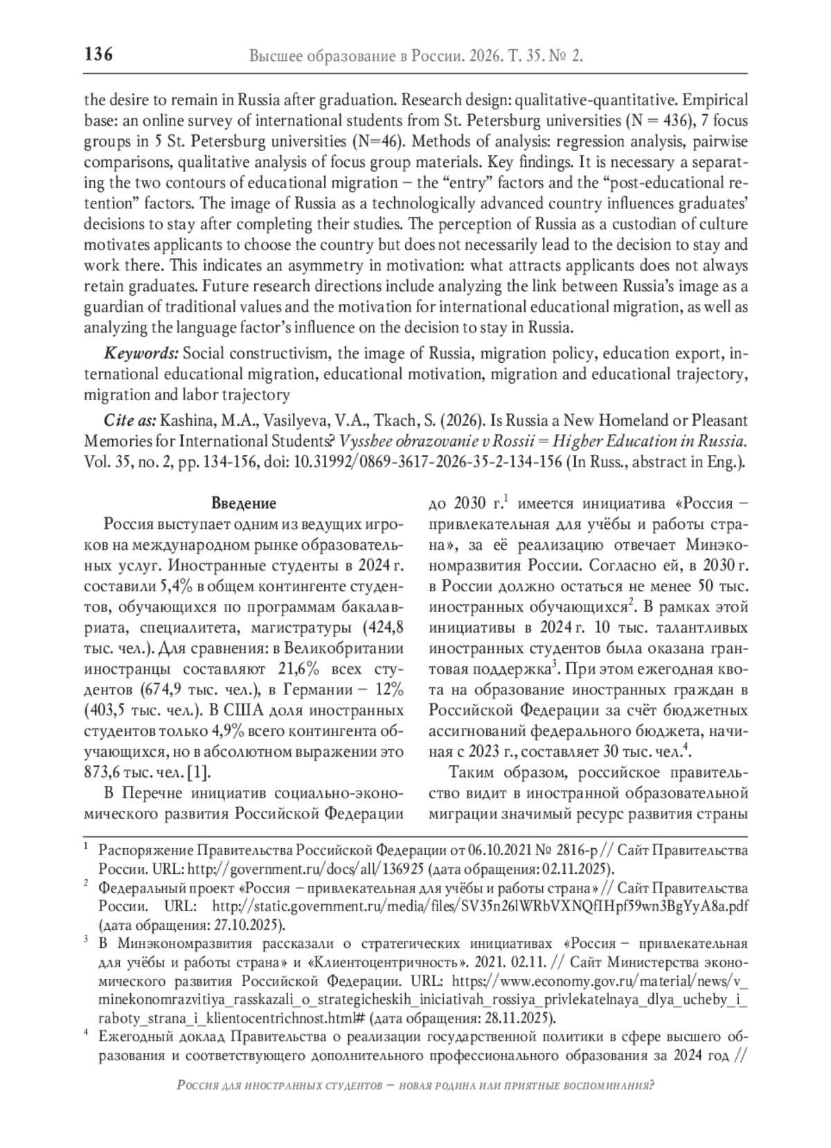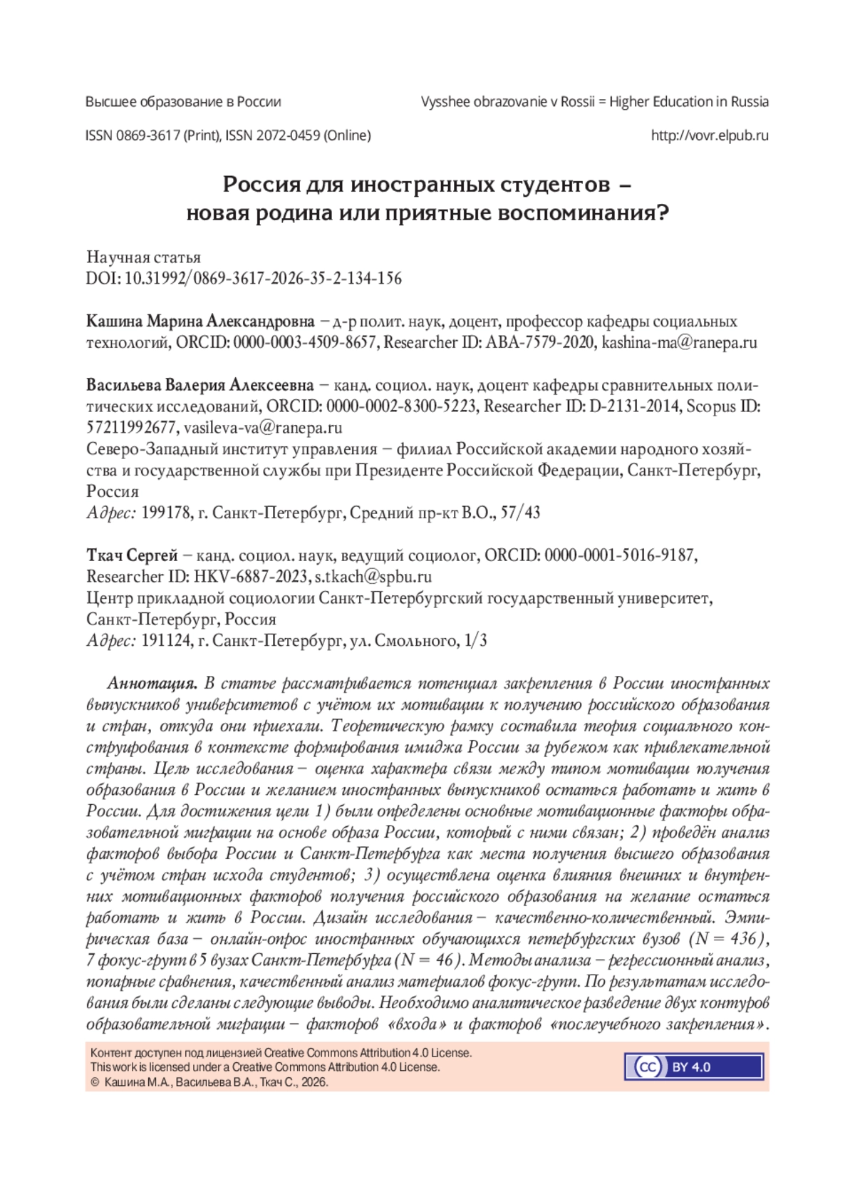6. Васильева В.А., Кашина М.А. Студенты из стран СНГ - (не)исчерпаемый ресурс петербургских вузов // Управленческое консультирование. - 2025. - № 4 (190). - С. 171-188. -. EDN: LSWOIW