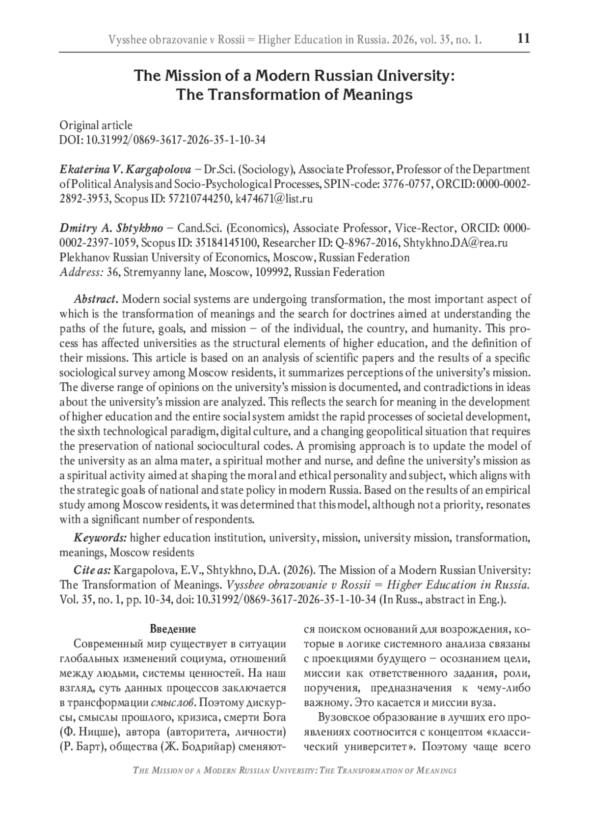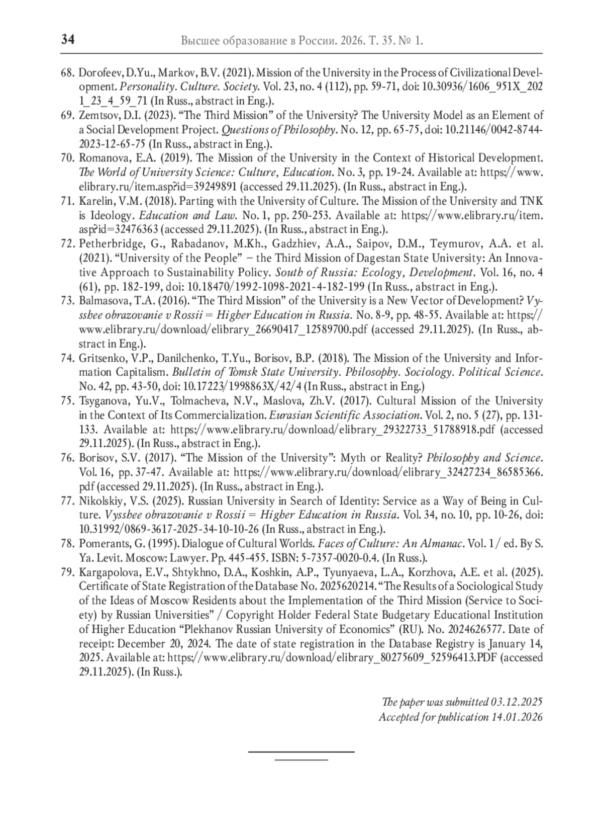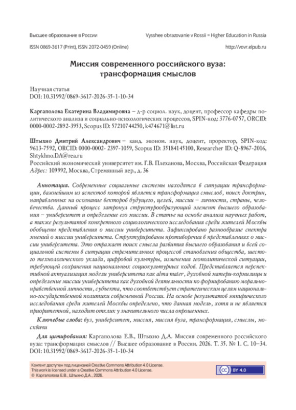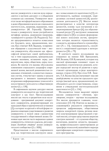 77. Никольский В.С. Российский университет в поисках идентичности:служение как способ бытия в культуре // Высшее образование в России. - 2025. - Т. 34, № 10. - С. 10-26. -. DOI: 10.31992/0869-3617-2025-34-10-10-26 EDN: GJVWAF