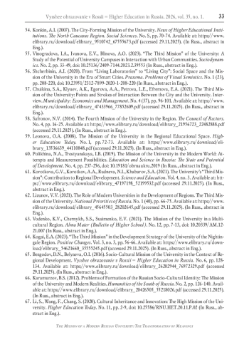61. Короткова Г.В., Коротков А.А., Руднева Н.И., Хабаров С.А. “Третья миссия” университета: вклад в региональное развитие // Наука и Образование. - 2021. - Т. 4, № 3. -. EDN: JXQGBC