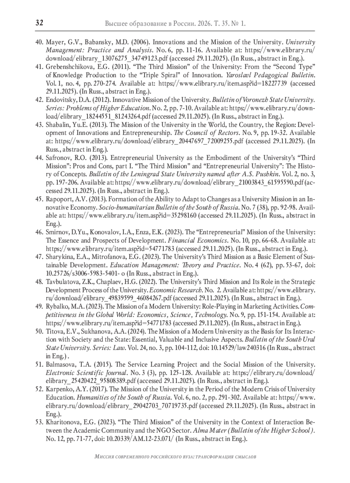47. Шарыкина Э.А., Митрофанова Е.Г. Третья миссия университета как базовый элемент устойчивого развития // Управление образованием: теория и практика. - 2023. - № 4 (62). - С. 53-67. -. DOI: 10.25726/s3006-5983-5401-o EDN: MYESRM