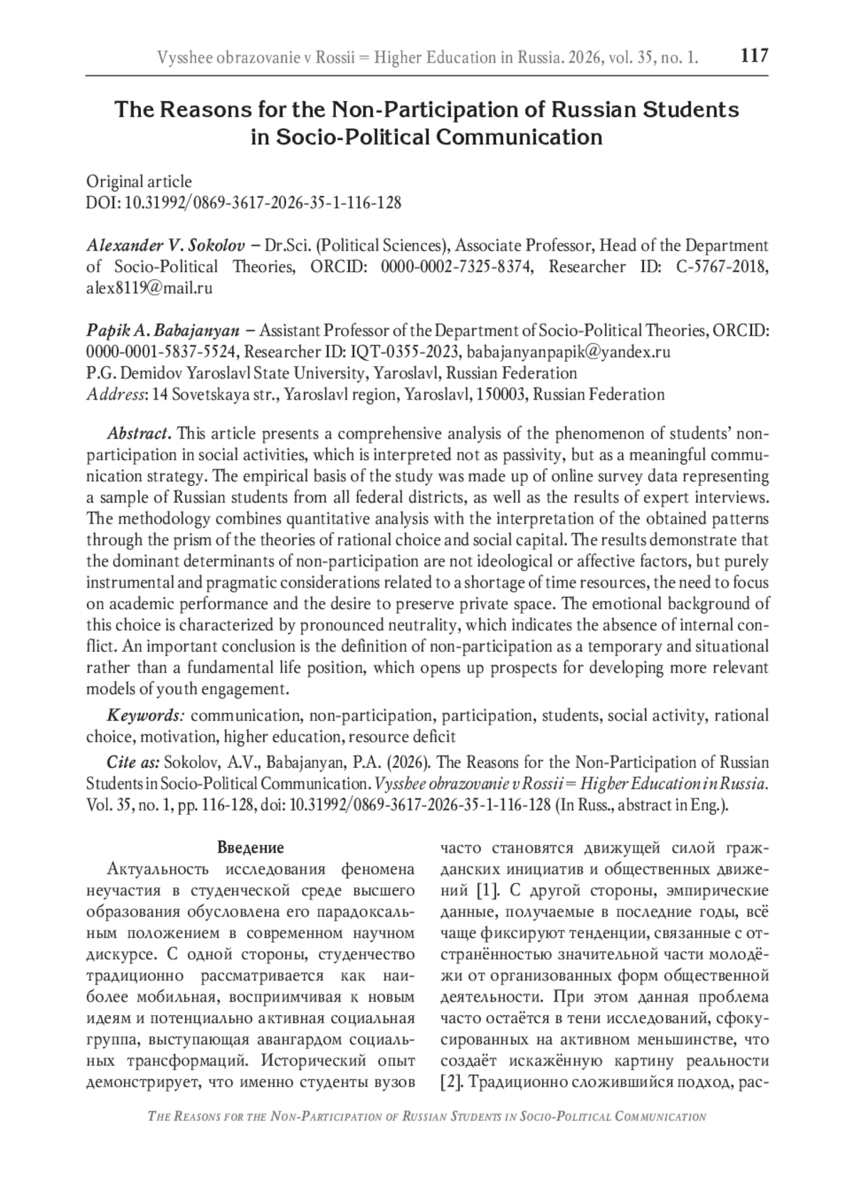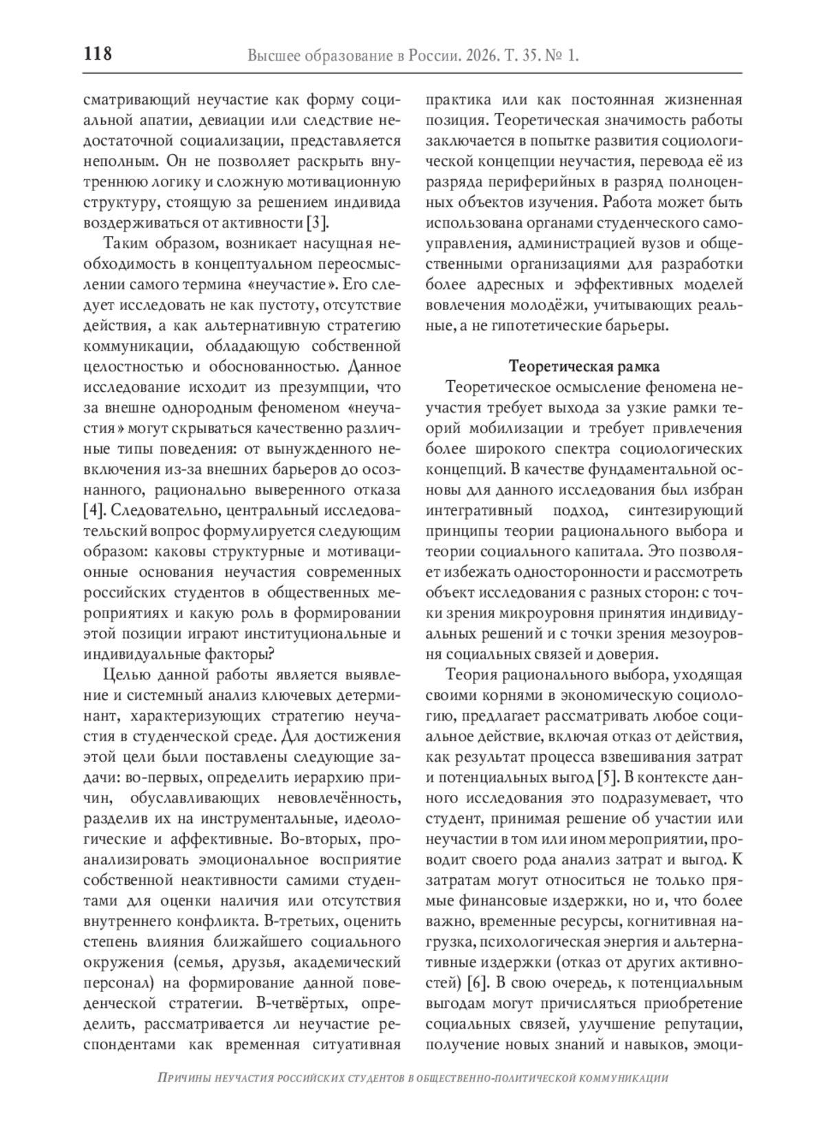 В данной статье представлен комплексный анализ феномена неучастия студентов в общественной деятельности, который интерпретируется не как пассивность, а как осмысленная коммуникационная стратегия. Эмпирическую базу исследования составили данные онлайн-опроса, репрезентирующие выборку российских студентов из всех федеральных округов, а также результаты интервью экспертов. Методика работы сочетает количественный анализ с интерпретацией полученных паттернов через призму теорий рационального выбора и социального капитала. Результаты демонстрируют, что доминирующими детерминантами неучастия являются не идеологические или аффективные факторы, а сугубо инструментальные и прагматичные соображения, связанные с дефицитом временных ресурсов, необходимостью концентрации на академической успеваемости и стремлением к сохранению приватного пространства. Эмоциональный фон этого выбора характеризуется выраженной нейтральностью, что свидетельствует об отсутствии внутреннего конфликта. Важным выводом является определение неучастия как временной и ситуативной, а не фундаментальной жизненной позиции, что открывает перспективы для разработки более релевантных моделей вовлечения молодёжи.