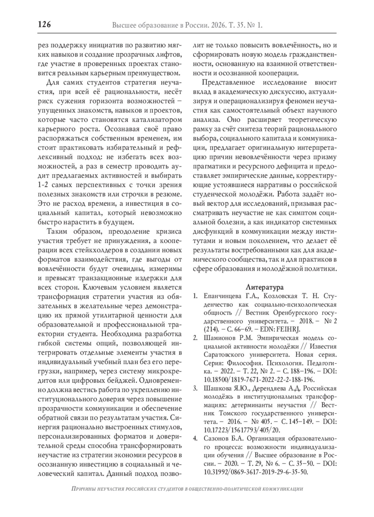 2. Шамионов Р.М. Эмпирическая модель социальной активности молодёжи // Известия Саратовского университета. Новая серия. Серия: Философия. Психология. Педагогика. - 2022. - Т. 22, № 2. - С. 188-196. -. DOI: 10.18500/1819-7671-2022-22-2-188-196 EDN: MYTXDK