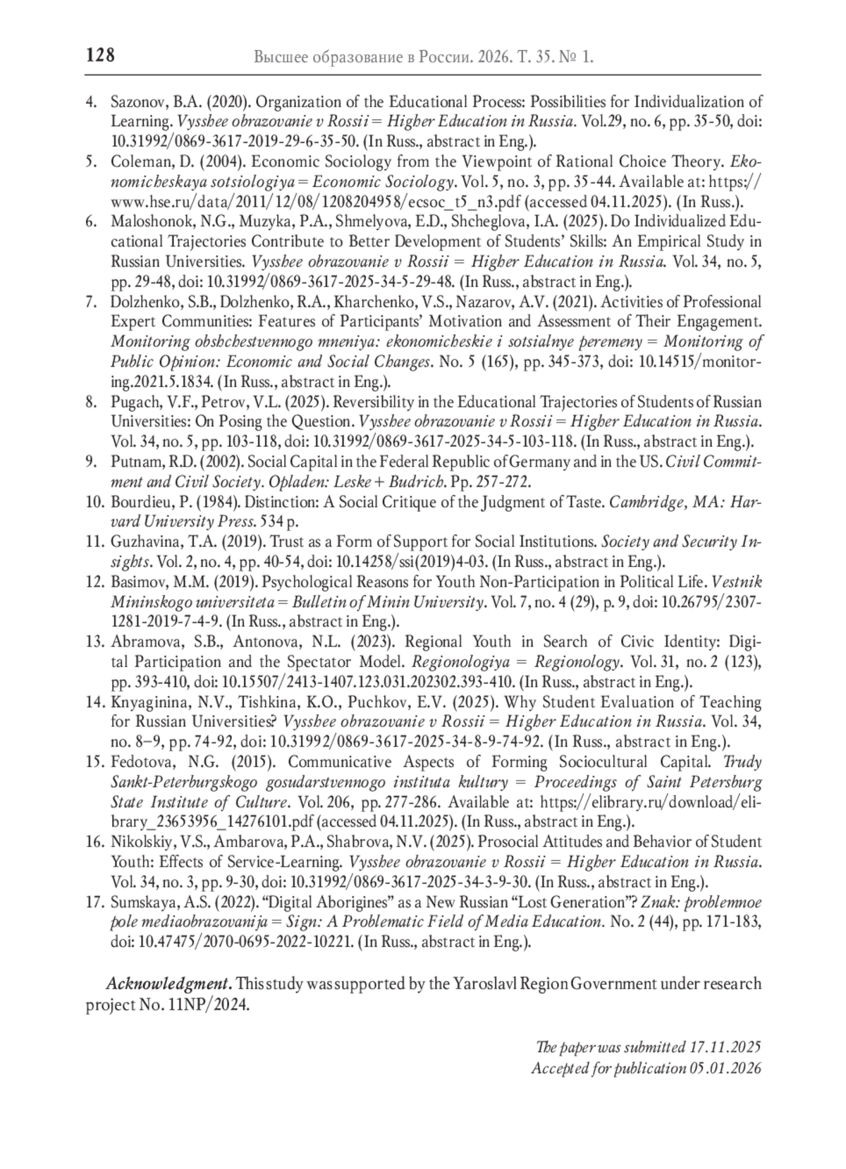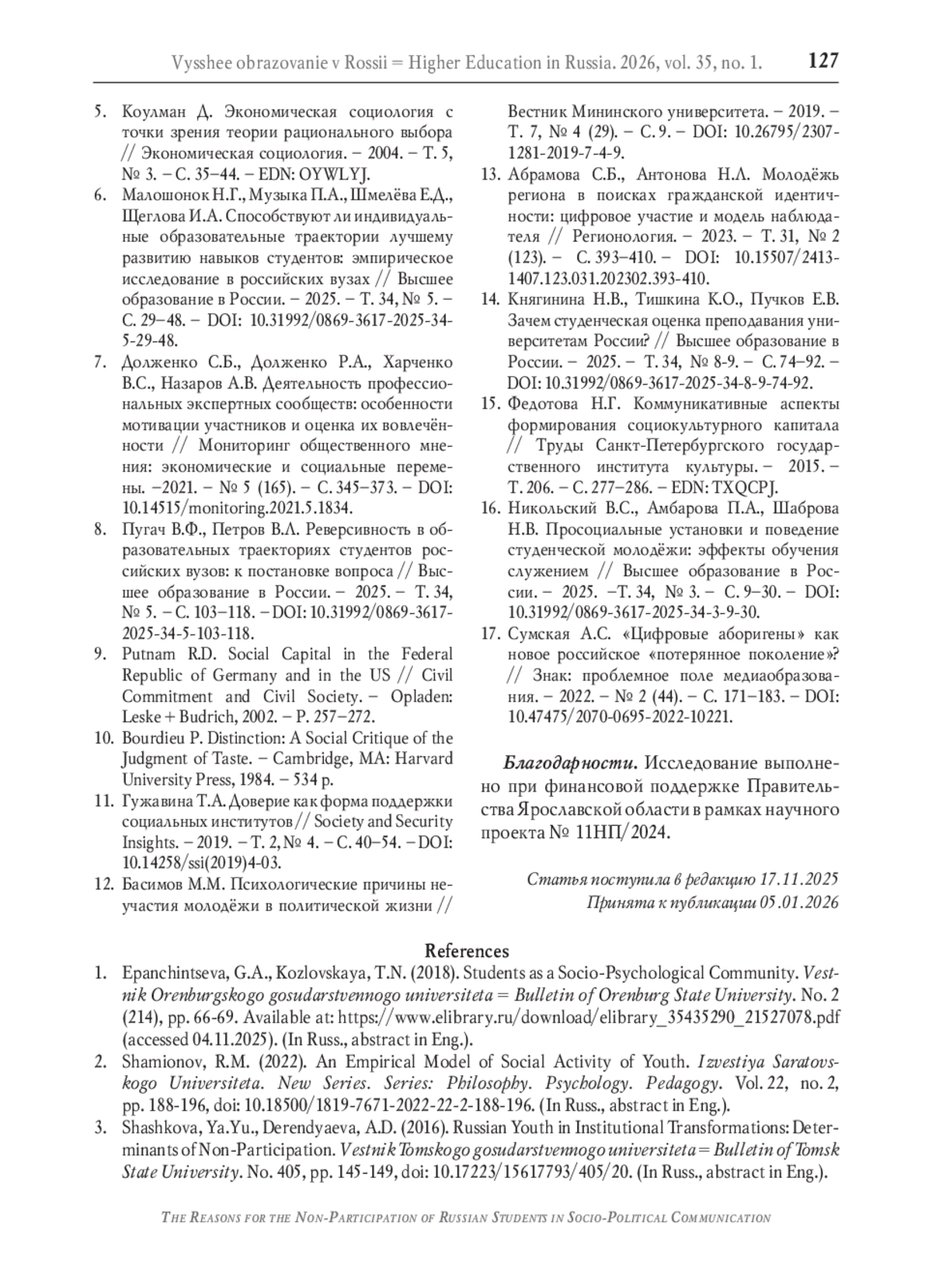 16. Никольский В.С., Амбарова П.А., Шаброва Н.В. Просоциальные установки и поведение студенческой молодёжи: эффекты обучения служением // Высшее образование в России. - 2025. -Т. 34, № 3. - С. 9-30. -. DOI: 10.31992/0869-3617-2025-34-3-9-30 EDN: QPCYQZ