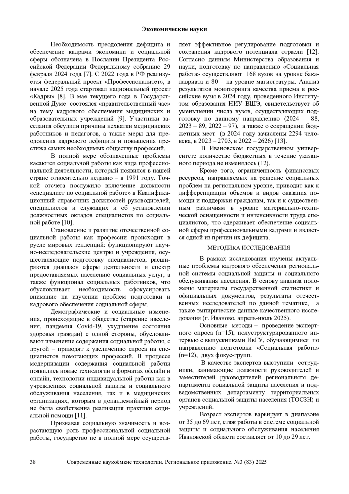 В статье рассматривается ряд актуальных проблем кадрового обеспечения социальной сферы на примере системы социальной защиты и социального обслуживания населения Ивановской области. Охарактеризованы основные причины, затрудняющие трудоустройство молодежи по полученной специальности, выявлены запросы работодателей к подготовке специалистов, обозначены меры, направленные на преодоление кадрового дефицита. Сделан вывод о том, что сохранение и развитие кадрового корпуса возможно при условии комплексного подхода к решению кадровой проблемы путем совершенствования государственного регулирования и управления.