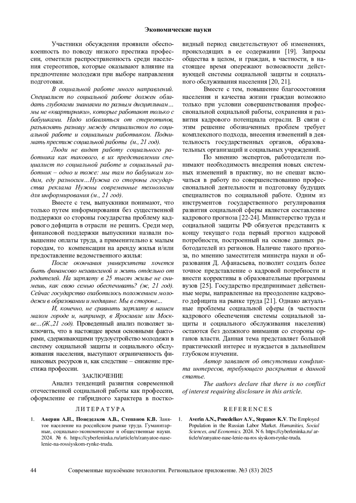 1. Аверин А.Н., Понеделков А.В., Степанов К.В. Занятое население на российском рынке труда. Гуманитарные, социально-экономические и общественные науки. 2024. № 6. https://cyberleninka.ru/article/n/zanyatoe-nase-lenie-na-rossiyskom-rynke-truda. EDN: BHWBHU