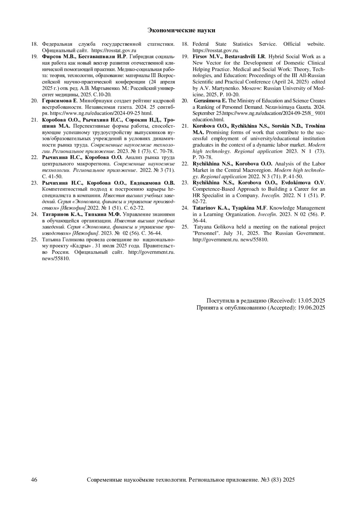 20. Герасимова Е. Минобрнауки создает рейтинг кадровой востребованости. Независимая газета. 2024. 25 сентября. https://www.ng.ru/education/2024-09-25html.