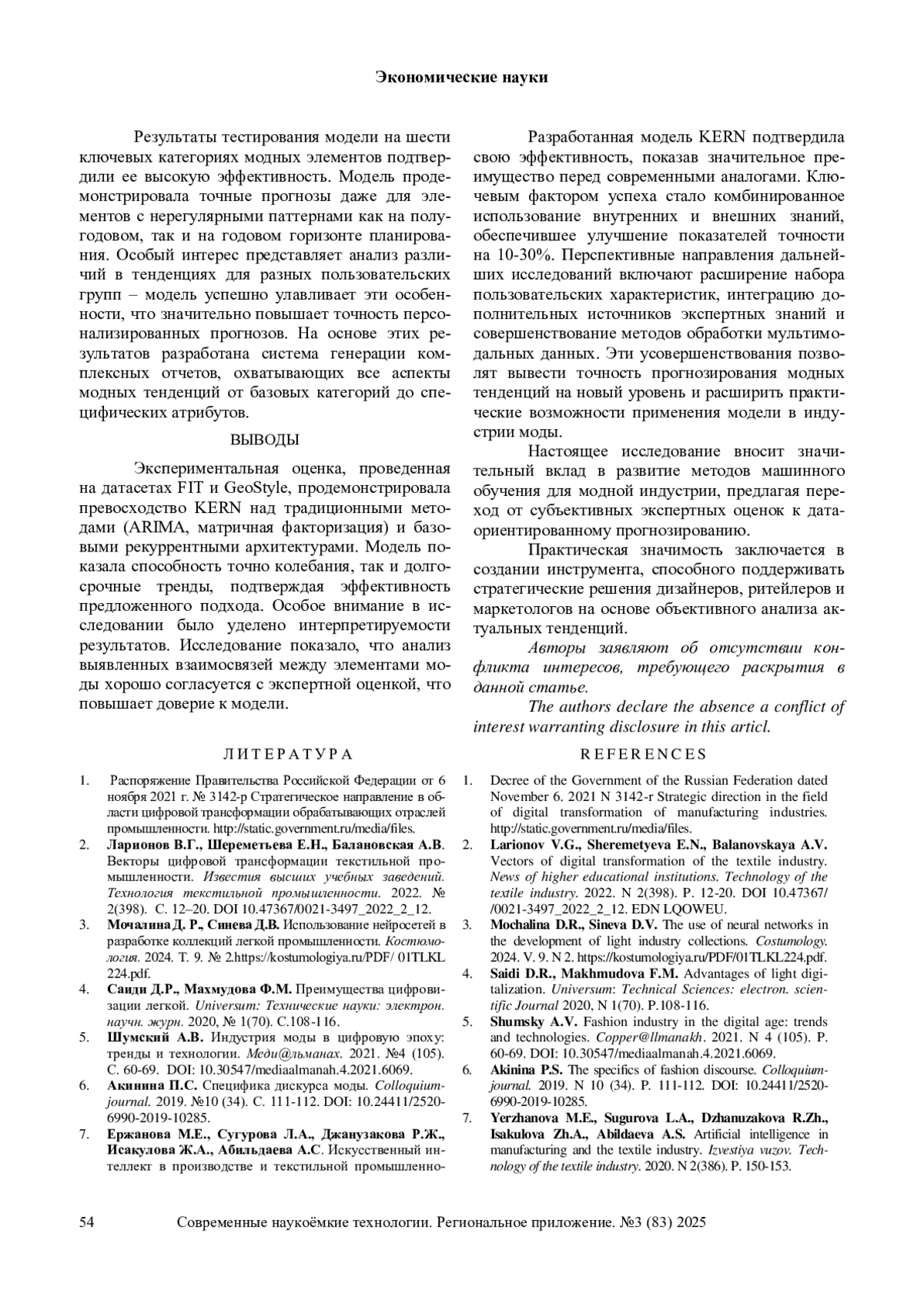 2. Ларионов В.Г., Шереметьева Е.Н., Балановская А.В. Векторы цифровой трансформации текстильной промышленности. Известия высших учебных заведений. Технология текстильной промышленности. 2022. № 2(398). С. 12-20. DOI: 10.47367/0021-3497_2022_2_12 EDN: LQOWEU