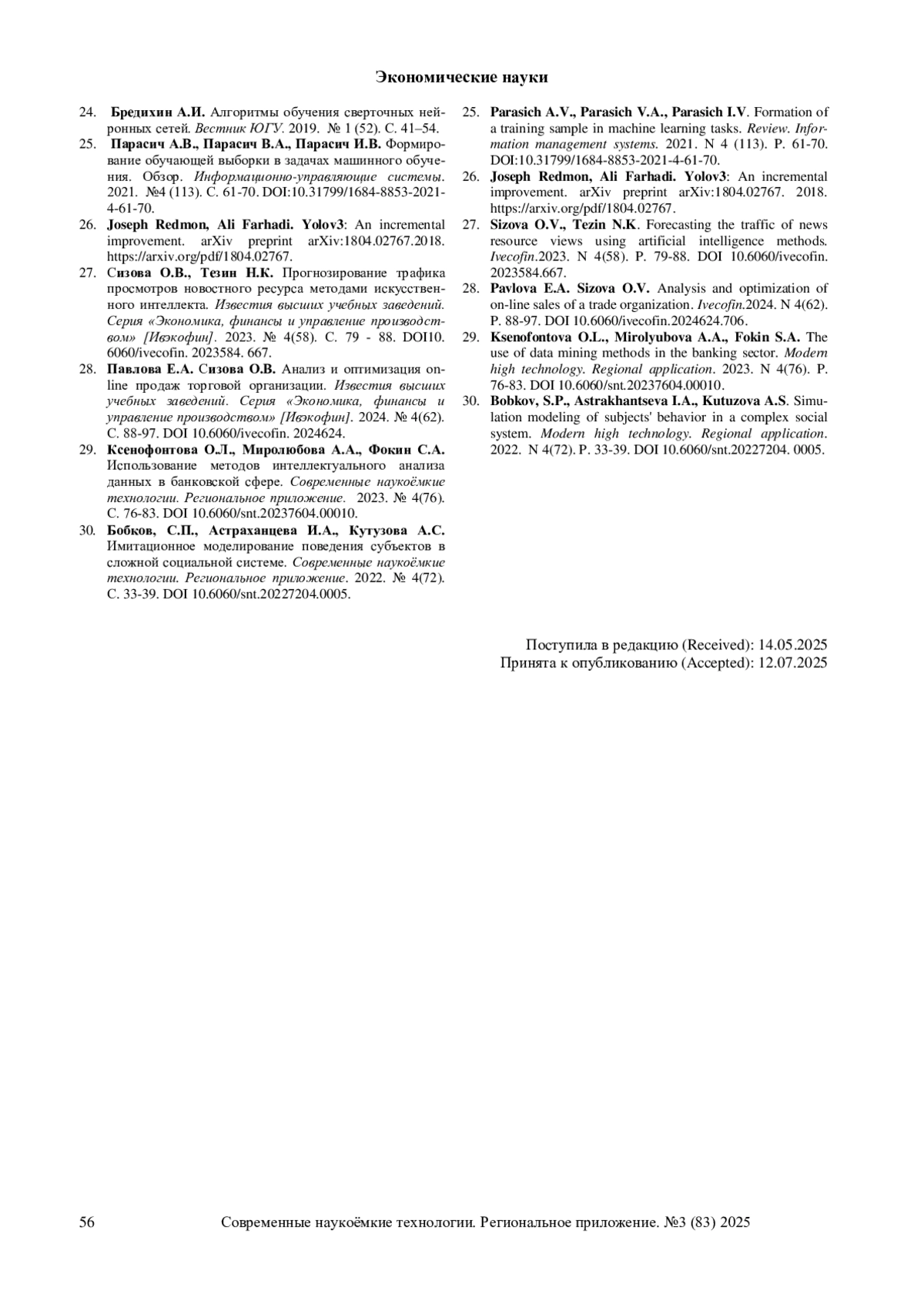 29. Ксенофонтова О.Л., Миролюбова А.А., Фокин С.А. Использование методов интеллектуального анализа данных в банковской сфере. Современные наукоёмкие технологии. Региональное приложение. 2023. № 4(76). С. 76-83. DOI: 10.6060/snt.20237604.00010 EDN: ZDZZAO