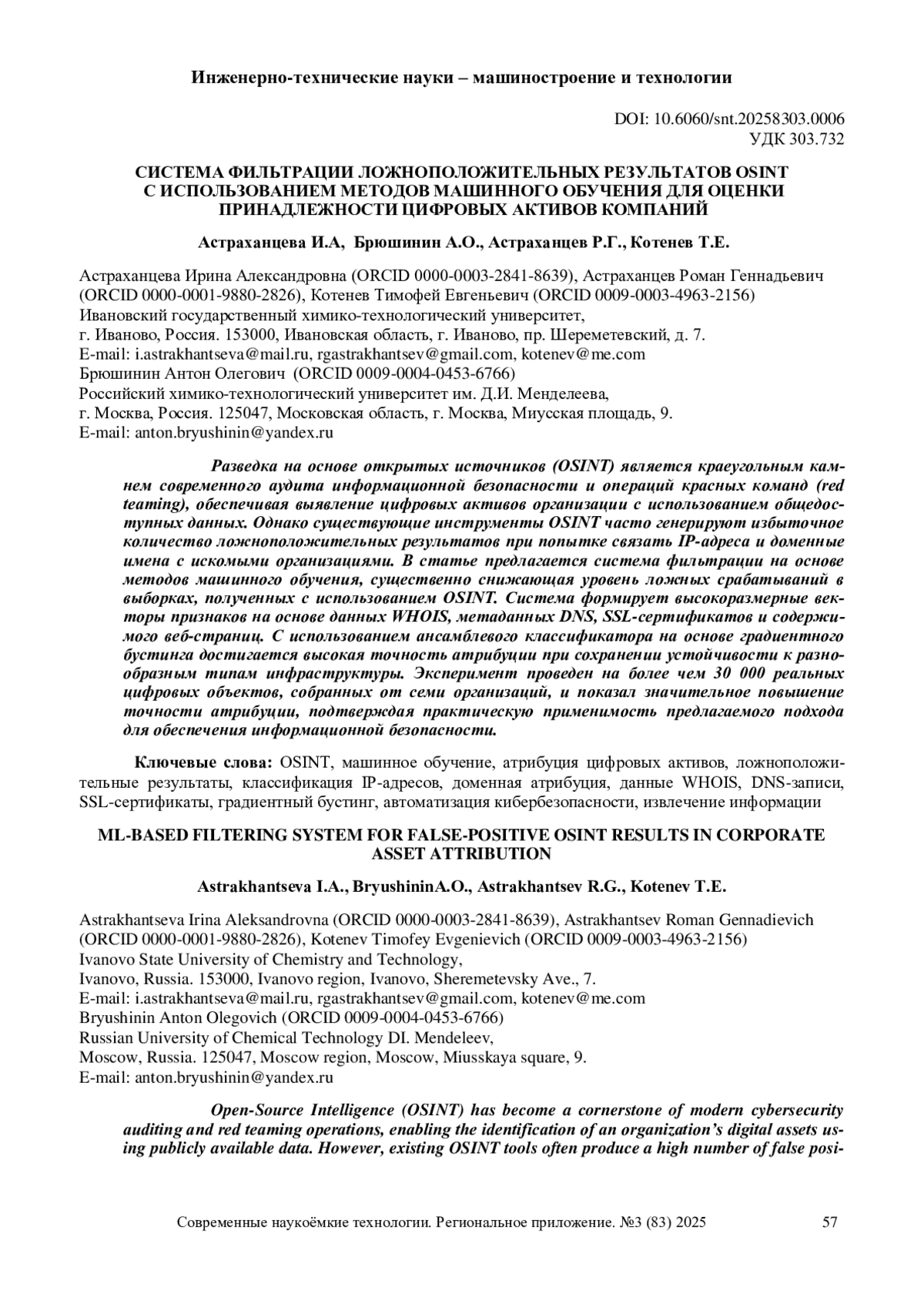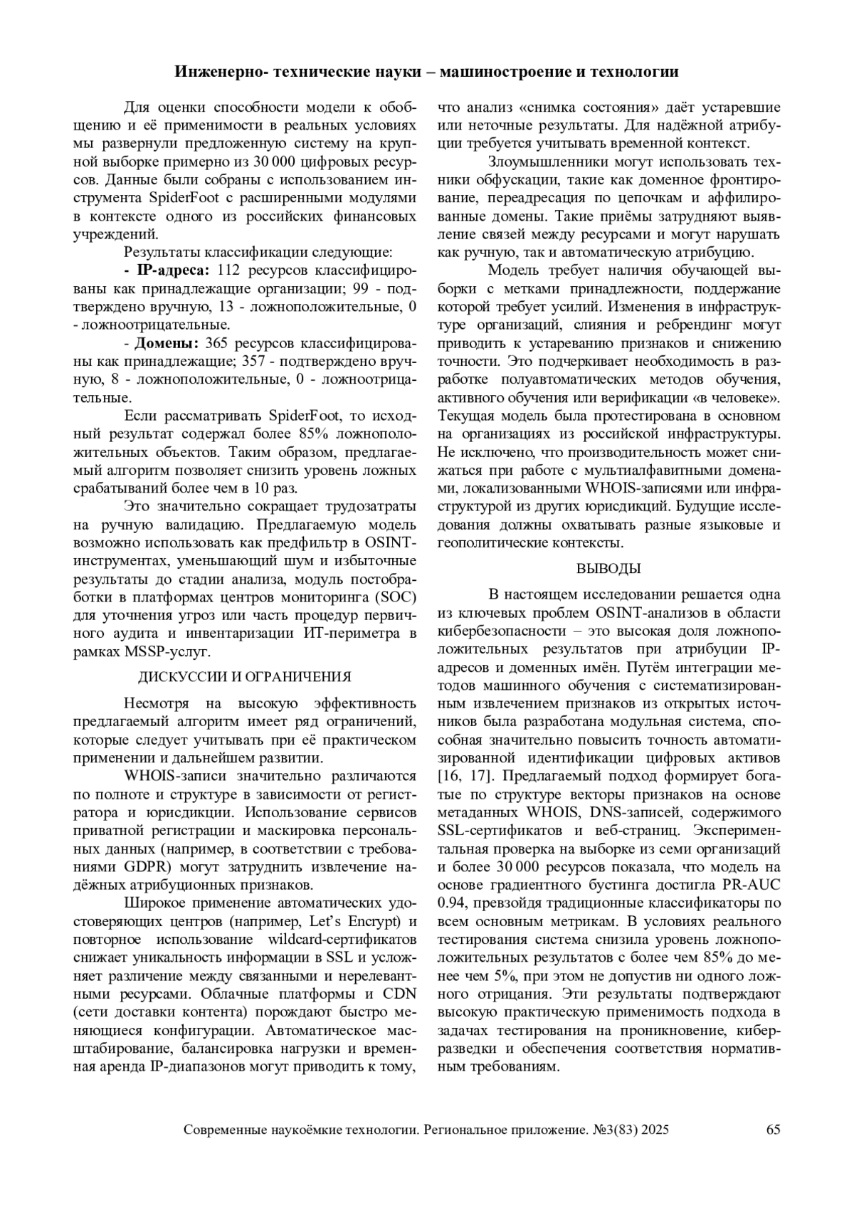 Разведка на основе открытых источников (OSINT) является краеугольным камнем современного аудита информационной безопасности и операций красных команд (red teaming), обеспечивая выявление цифровых активов организации с использованием общедоступных данных. Однако существующие инструменты OSINT часто генерируют избыточное количество ложноположительных результатов при попытке связать IP-адреса и доменные имена с искомыми организациями. В статье предлагается система фильтрации на основе методов машинного обучения, существенно снижающая уровень ложных срабатываний в выборках, полученных с использованием OSINT. Система формирует высокоразмерные векторы признаков на основе данных WHOIS, метаданных DNS, SSL-сертификатов и содержимого веб-страниц. С использованием ансамблевого классификатора на основе градиентного бустинга достигается высокая точность атрибуции при сохранении устойчивости к разнообразным типам инфраструктуры. Эксперимент проведен на более чем 30 000 реальных цифровых объектов, собранных от семи организаций, и показал значительное повышение точности атрибуции, подтверждая практическую применимость предлагаемого подхода для обеспечения информационной безопасности.