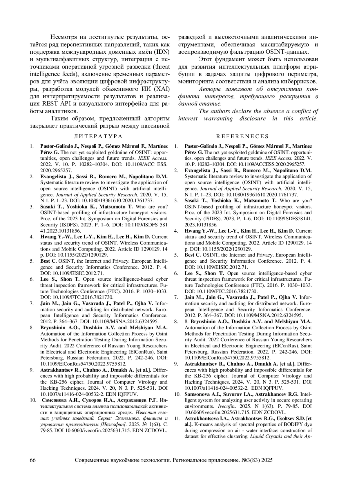 4. Hwang Y.-W., Lee I.-Y., Kim H., Lee H., Kim D. Current status and security trend of OSINT. Wireless Communications and Mobile Computing. 2022. Article ID 1290129. 14 p. DOI: 10.1155/2022/1290129 EDN: DBOAFE