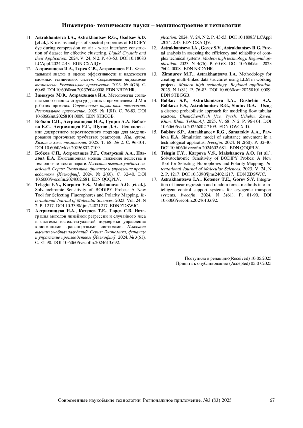 11. Astrakhantseva I.A., Astrakhantsev R.G., Usoltsev S.D. [et al.]. K-means analysis of spectral properties of BODIPY dye during compression on air - water interface: construction of dataset for effective clustering. Liquid Crystals and their Application. 2024. V. 24, N 2. P. 43-53. DOI 10.18083 LCAppl.2024.2.43. EDN: CXAIQV
