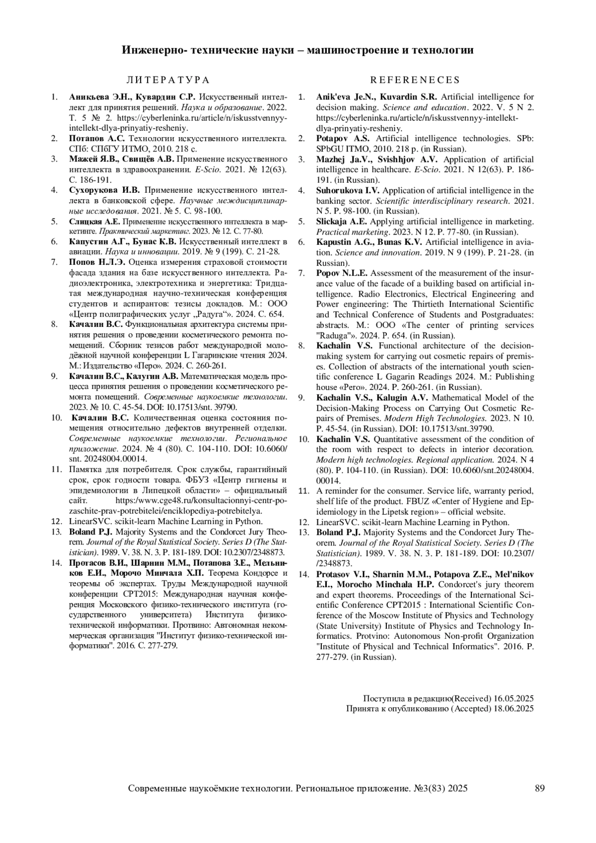 10. Качалин В.С. Количественная оценка состояния помещения относительно дефектов внутренней отделки. Современные наукоемкие технологии. Региональное приложение. 2024. № 4 (80). С. 104-110. 10.6060/ snt. 20248004.00014. DOI: 10.6060/snt.20248004.00014 EDN: PDNGAY