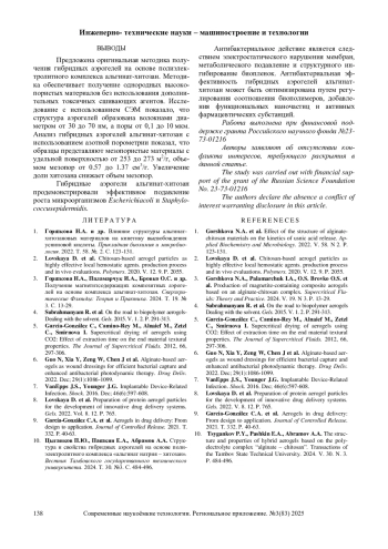 10. Цыганков П.Ю., Пашкин Е.А., Абрамов А.А. Структура и свойства гибридных аэрогелей на основе полиэлектролитного комплекса “альгинат натрия - хитозан”. Вестник Тамбовского государственного технического университета. 2024. Т. 30. №3. C. 484-496. EDN: MNGQEZ