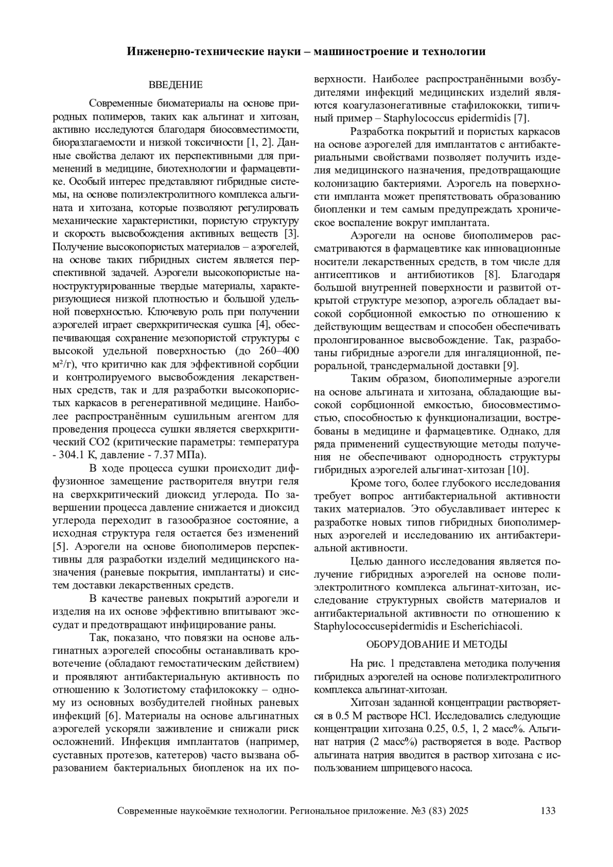 Современные биоматериалы на основе природных полимеров, таких как альгинат и хитозан, активно исследуются благодаря биосовместимости, биоразлагаемости и низкой токсичности [1, 2].