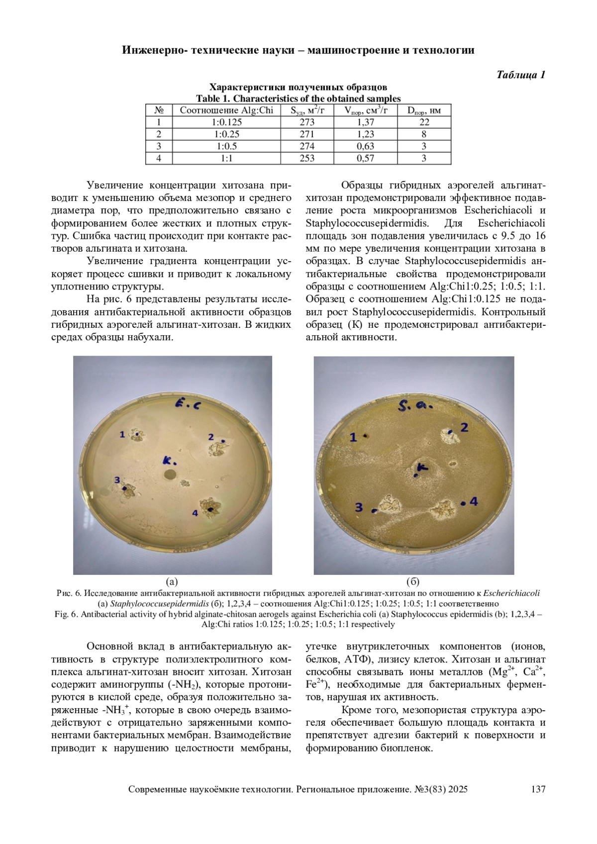 Гибридные аэрогели на основе биополимеров представляют собой перспективные материалы для биомедицинских применений благодаря уникальной контролируемой пористой структуре, биосовместимости. Широкое распространение получили такие биополимеры, как альгинат и хитозан, однако, их индивидуальные аэрогели зачастую обладают ограниченной стабильностью, низкой антибактериальной активностью. В данной работе разработан новый метод получения гибридных аэрогелей альгинат-хитозан, направленный на преодоление этих ограничений. Предложенный подход позволяет получить материалы с высокой удельной поверхностью (до 273 м2/г), объемом мезопор (до 1,37 см3/г) и антибактериальной активностью в отношении Staphylococcusepidermidis и Escherichiacoli. Разработанные гибридные аэрогели могут быть использованы в качестве изделий медицинского назначения (раневые покрытия, имплантаты) и систем доставки лекарственных средств. Исследование вносит вклад в разработку экологически безопасных материалов, актуальных для решения задач медицины и фармацевтики, и предоставляет основу для дальнейшей оптимизации функциональных свойств гибридных аэрогелей на основе биополимеров.