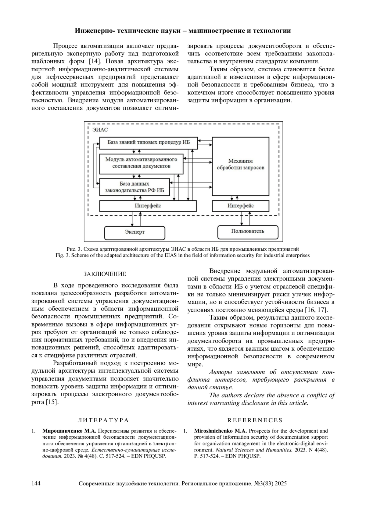 1. Мирошниченко М.А. Перспективы развития и обеспечение информационной безопасности документационного обеспечения управления организацией в электронно-цифровой среде. Естественно-гуманитарные исследования. 2023. № 4(48). С. 517-524. EDN: PHQUSP