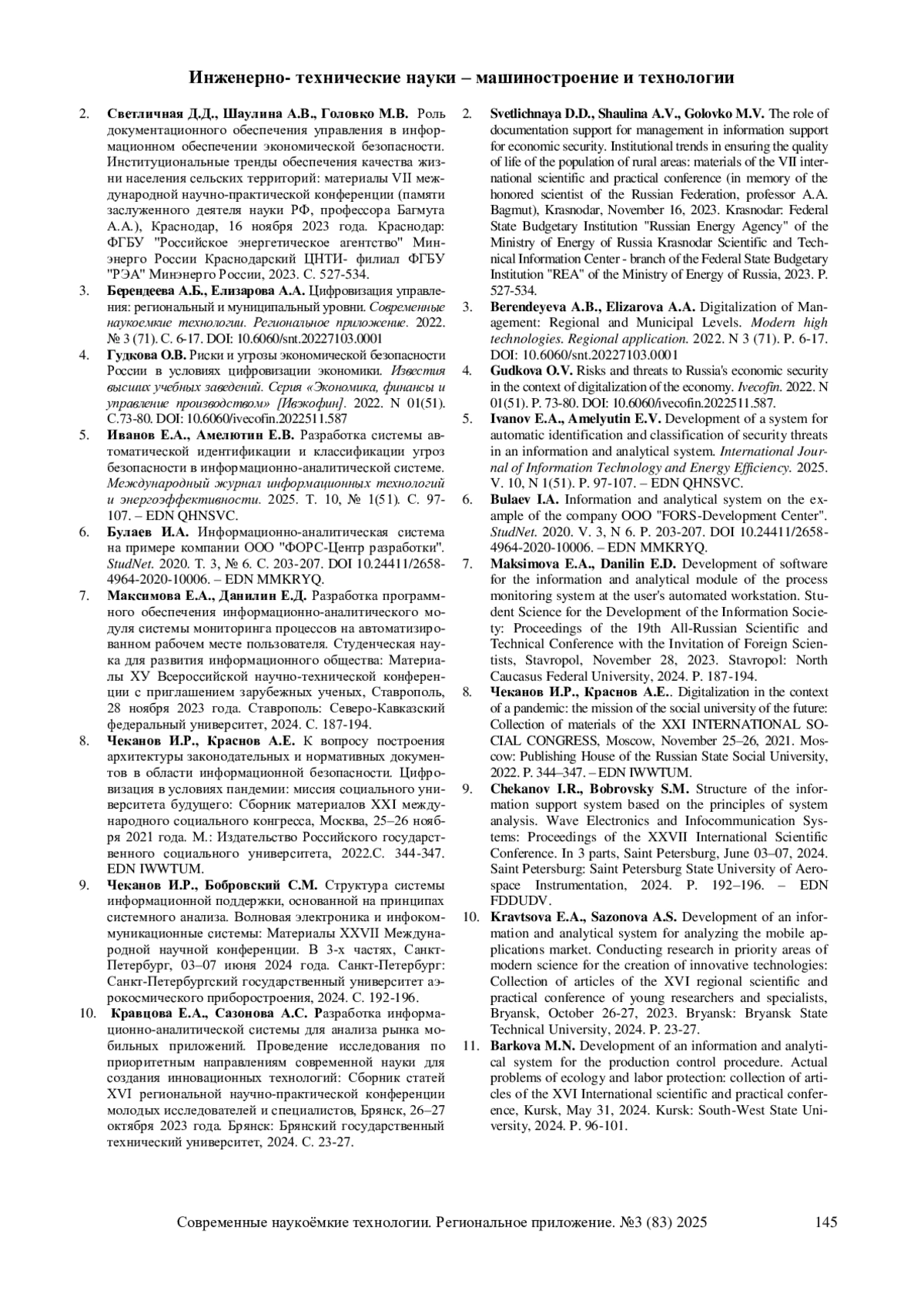 5. Иванов Е.А., Амелютин Е.В. Разработка системы автоматической идентификации и классификации угроз безопасности в информационно-аналитической системе. Международный журнал информационных технологий и энергоэффективности. 2025. Т. 10, № 1(51). С. 97-107. EDN: QHNSVC