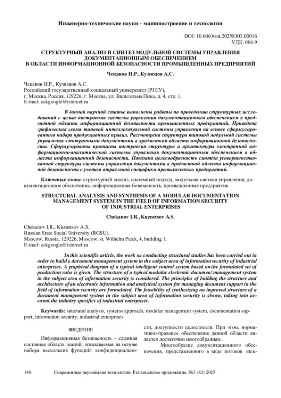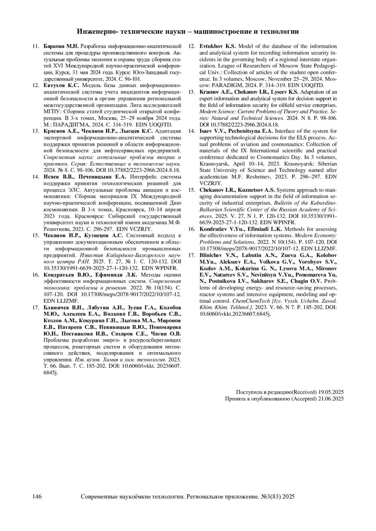 15. Чеканов И.Р., Кузнецов А.С. Системный подход к управлению документационным обеспечением в области информационной безопасности промышленных предприятий. Известия Кабардино-Балкарского научного центра РАН. 2025. Т. 27, № 1. С. 120-132. DOI: 10.35330/1991-6639-2025-27-1-120-132 EDN: WPINFR
