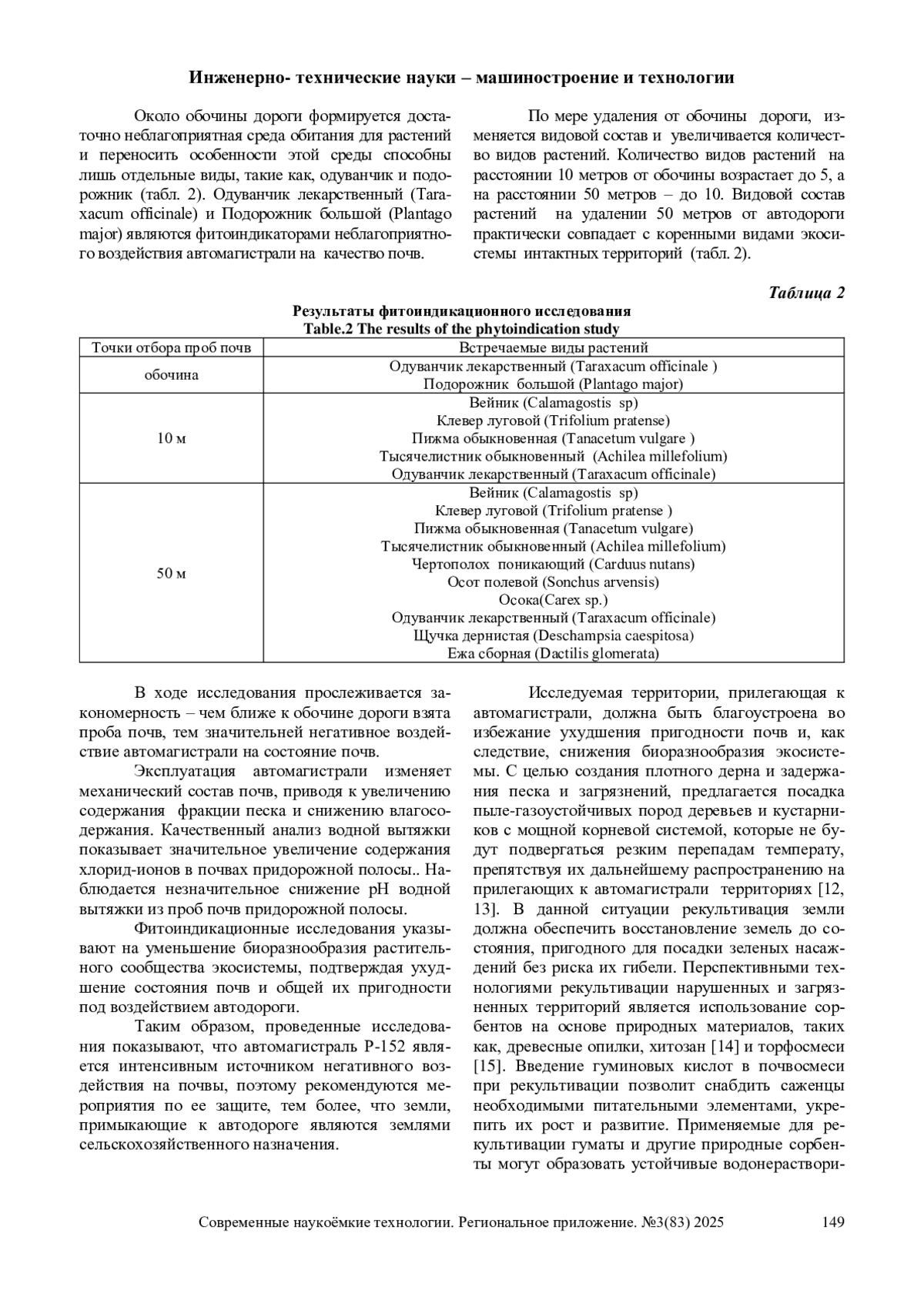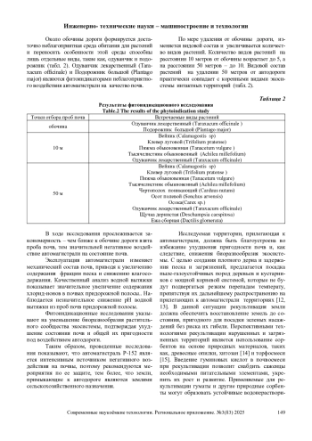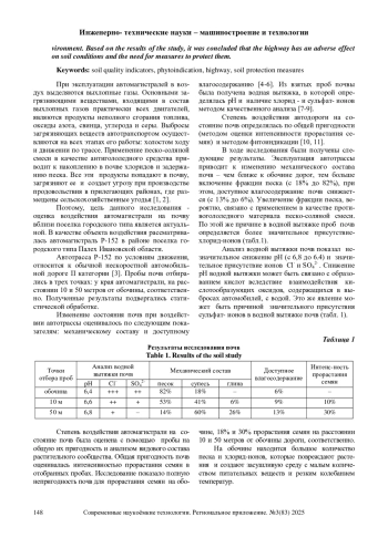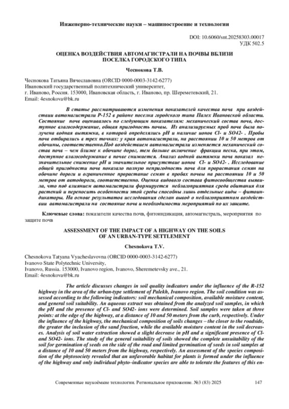 В статье рассматриваются изменения показателей качества почв при воздействии автомагистрали Р-152 в районе поселка городского типа Палех Ивановской области. Состояние почв оценивалось по следующим показателям: механический состав почв, доступное влагосодержание, общая пригодность почвы. Из анализируемых проб почв была получена водная вытяжка, в которой определялись рН и наличие ионов Cl- и SO42-. Пробы почв отбирались в трех точках: у края автомагистрали, на расстоянии 10 и 50 метров от обочины, соответственно. Под воздействием автомагистрали изменяется механический состав почв - чем ближе к обочине дорог, тем больше включение фракции песка, при этом, доступное влагосодержание в почве снижается. Анализ водной вытяжки почв показал незначительное снижение рН и значительное присутствие ионов Cl- и SO42-. Исследование общей пригодности почв показало полную непригодность почв для прорастания семян на обочине дороги и ограниченное прорастание семян в пробах почвы на расстоянии 10 и 50 метров от автодороги, соответственно. Оценка видового состава фитосообщества выявила, что под влиянием автомагистрали формируется неблагоприятная среда обитания для растений и переносить особенности этой среды способны лишь отдельные виды - фитоиндикаторы. На основе результатов исследования сделан вывод о неблагоприятном воздействии автомагистрали на состояние почв и необходимости мероприятий по их защите.