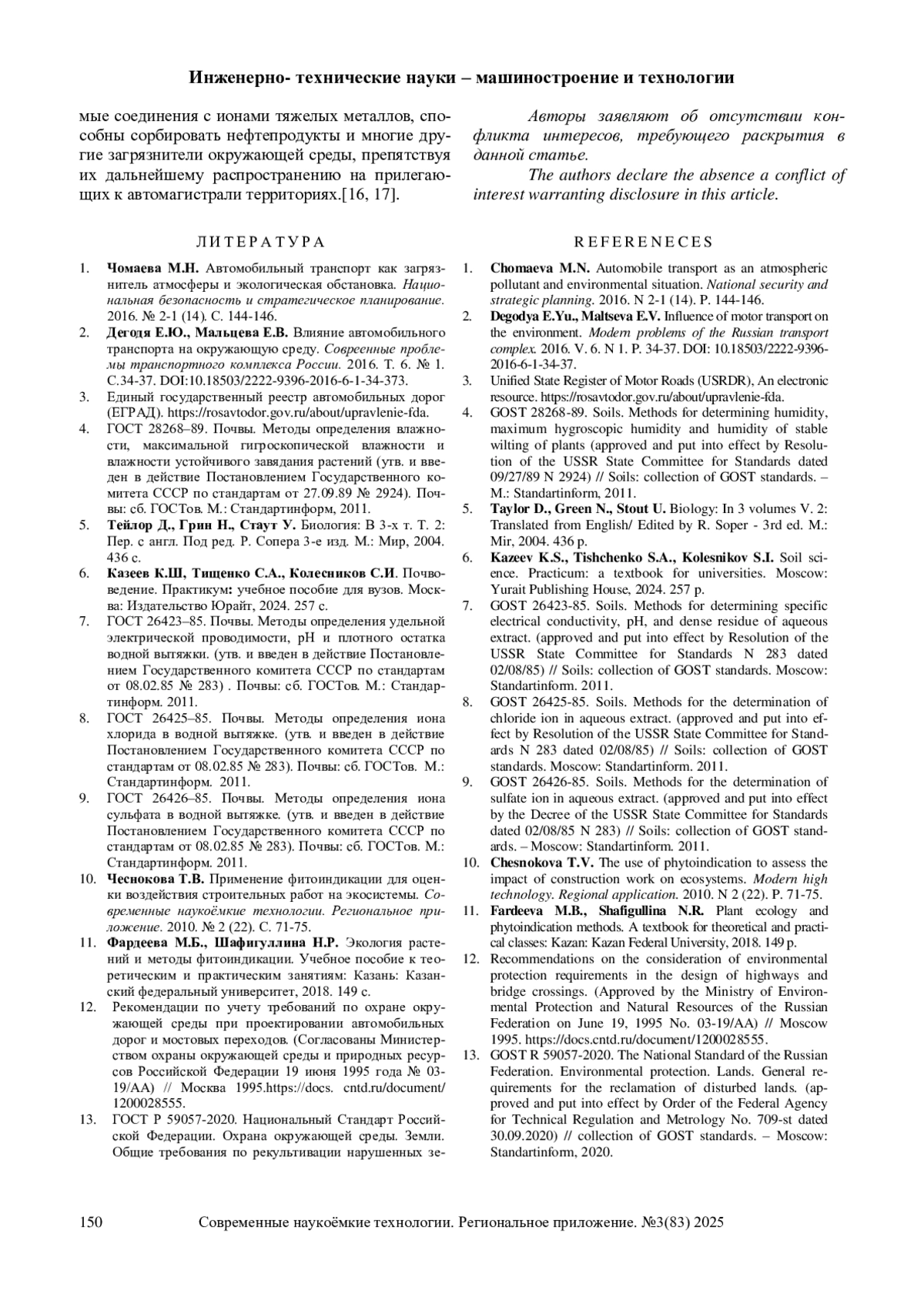 2. Дегодя Е.Ю., Мальцева Е.В. Влияние автомобильного транспорта на окружающую среду. Современные проблемы транспортного комплекса России. 2016. Т. 6. № 1. С.34-37. DOI: 10.18503/2222-9396-2016-6-1-34-373 EDN: XHSDRL