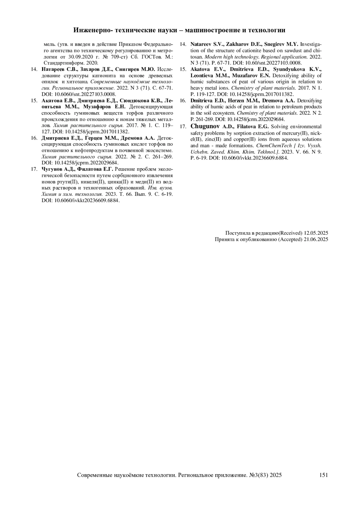 15. Акатова Е.В., Дмитриева Е.Д., Сюндюкова К.В., Леонтьева М.М., Музафаров Е.Н. Детоксицирующая способность гуминовых веществ торфов различного происхождения по отношению к ионам тяжелых металлов. Химия растительного сырья. 2017. № 1. С. 119-127. DOI: 10.14258/jcprm.2017011382 EDN: YGDKZB