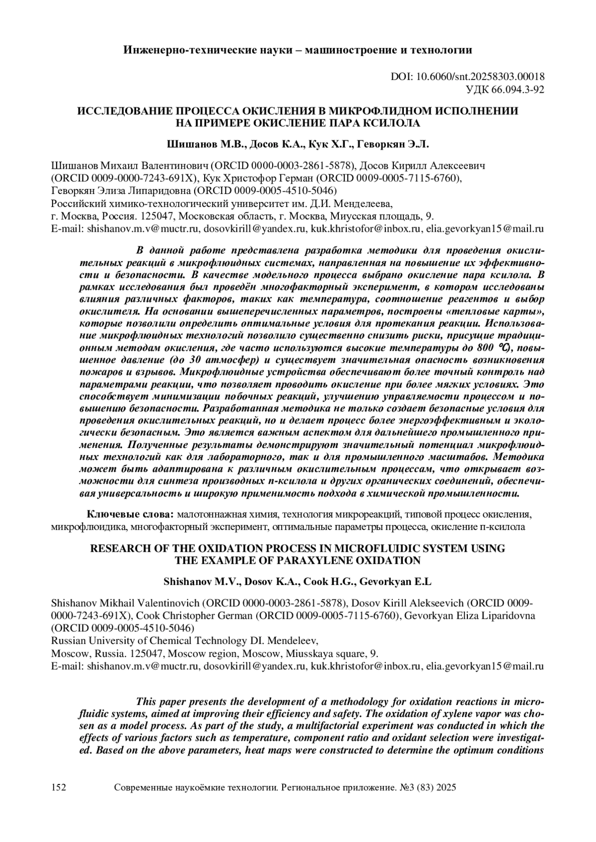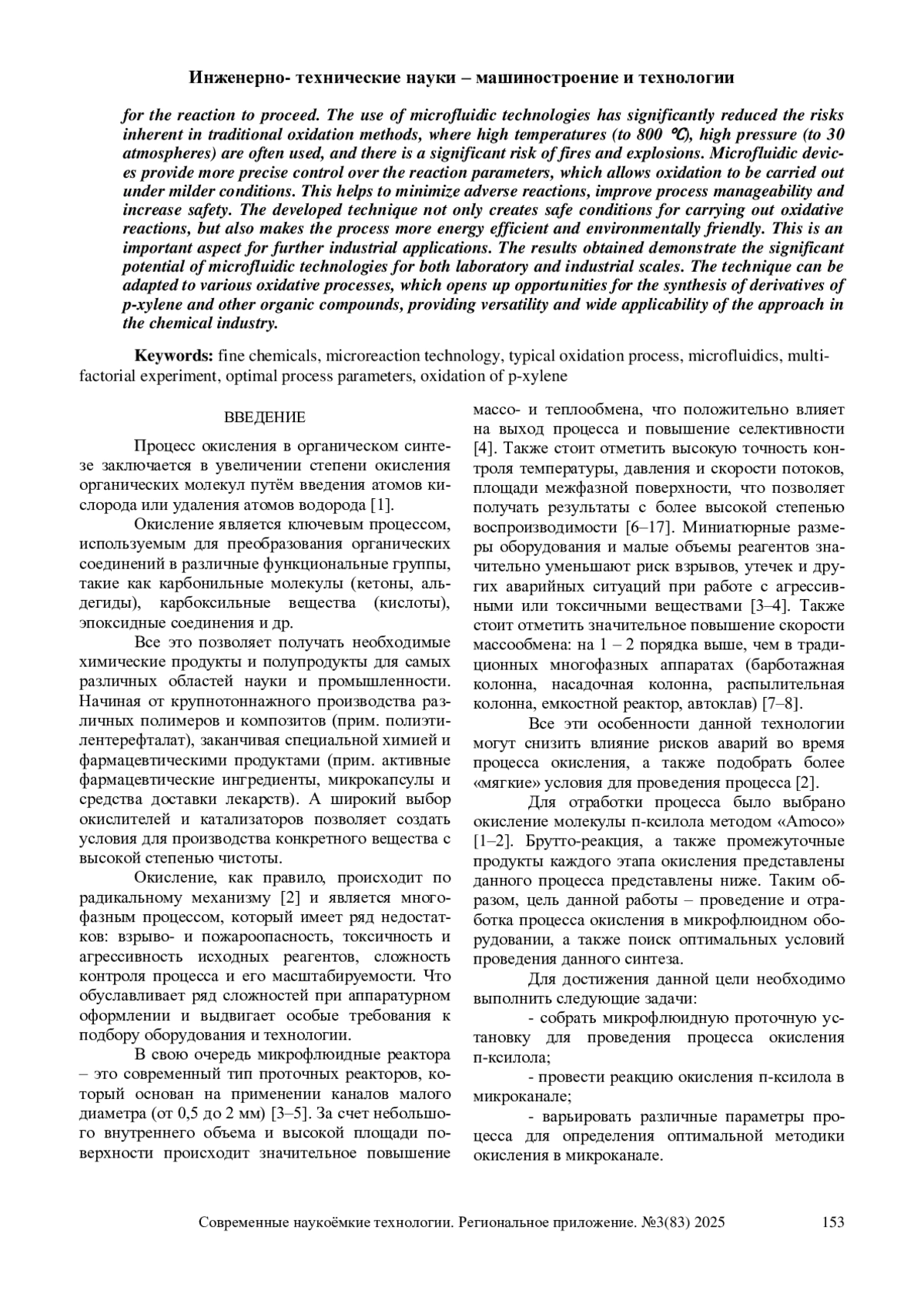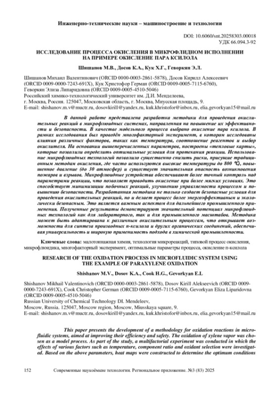 В данной работе представлена разработка методики для проведения окислительных реакций в микрофлюидных системах, направленная на повышение их эффективности и безопасности. В качестве модельного процесса выбрано окисление пара ксилола. В рамках исследования был проведён многофакторный эксперимент, в котором исследованы влияния различных факторов, таких как температура, соотношение реагентов и выбор окислителя. На основании вышеперечисленных параметров, построены «тепловые карты», которые позволили определить оптимальные условия для протекания реакции. Использование микрофлюидных технологий позволило существенно снизить риски, присущие традиционным методам окисления, где часто используются высокие температуры до 800 ℃), повышенное давление (до 30 атмосфер) и существует значительная опасность возникновения пожаров и взрывов. Микрофлюидные устройства обеспечивают более точный контроль над параметрами реакции, что позволяет проводить окисление при более мягких условиях. Это способствует минимизации побочных реакций, улучшению управляемости процессом и повышению безопасности. Разработанная методика не только создает безопасные условия для проведения окислительных реакций, но и делает процесс более энергоэффективным и экологически безопасным. Это является важным аспектом для дальнейшего промышленного применения. Полученные результаты демонстрируют значительный потенциал микрофлюидных технологий как для лабораторного, так и для промышленного масштабов. Методика может быть адаптирована к различным окислительным процессам, что открывает возможности для синтеза производных п-ксилола и других органических соединений, обеспечивая универсальность и широкую применимость подхода в химической промышленности.