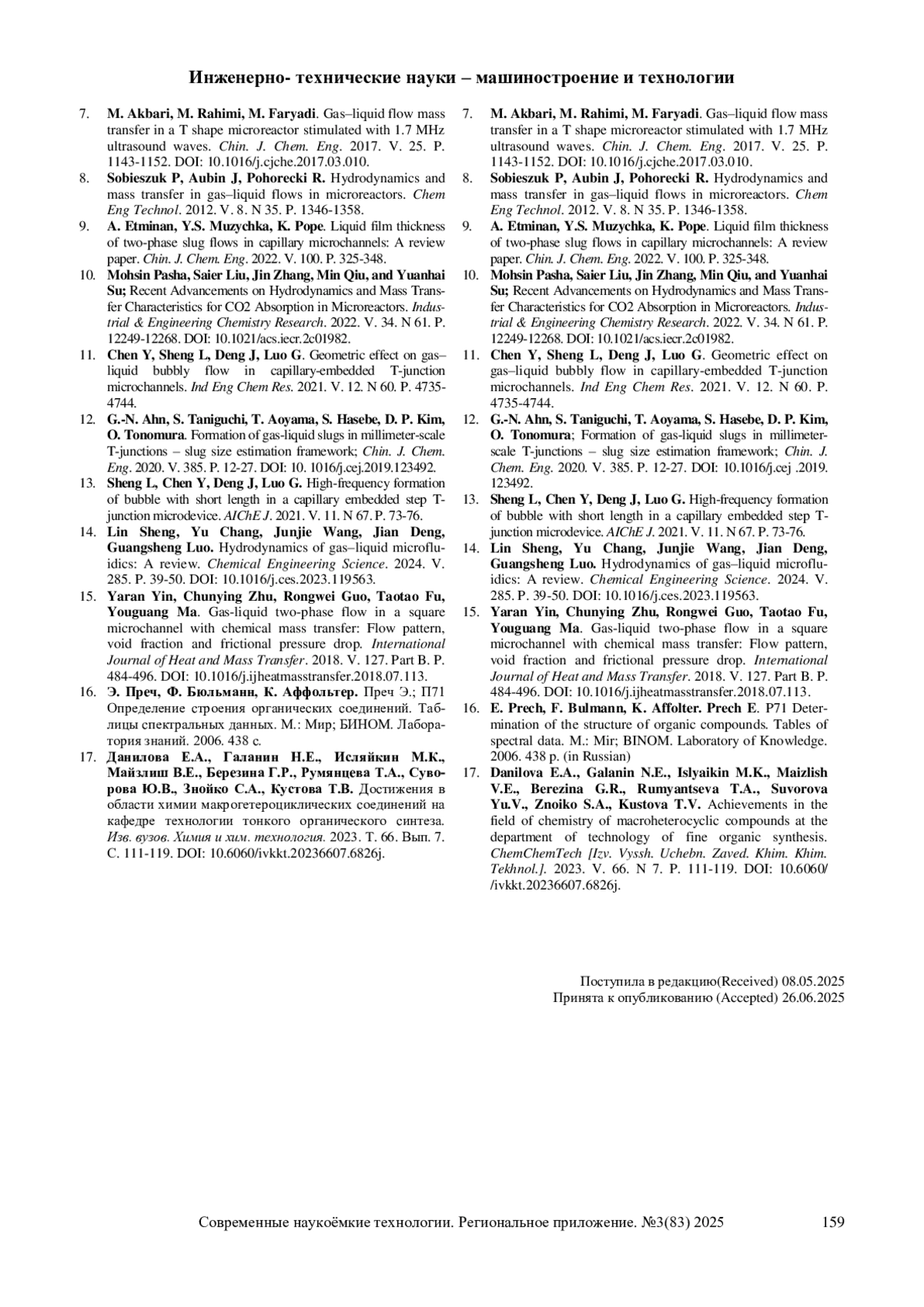 7. M. Akbari, M. Rahimi, M. Faryadi. Gas-liquid flow mass transfer in a T shape microreactor stimulated with 1.7 MHz ultrasound waves. Chin. J. Chem. Eng. 2017. V. 25. P. 1143-1152. DOI: 10.1016/j.cjche.2017.03.010
