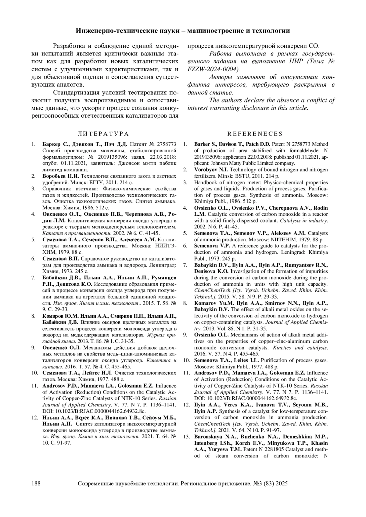 12. Ильин А.А., Верес К.А., Иванова Т.В., Сейоум М.Б., Ильин А.П. Синтез катализатора низкотемпературной конверсии монооксида углерода в производстве аммиака. Изв. вузов. Химия и хим. технология. 2021. Т. 64. № 10. С. 91-97.